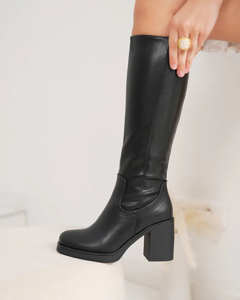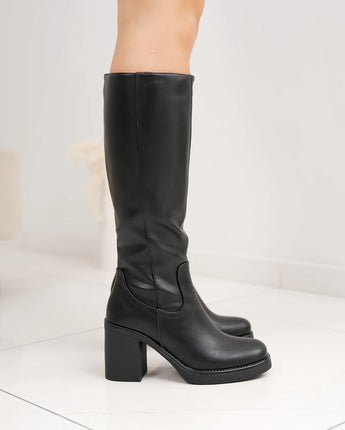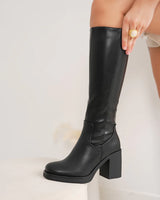 Maak een statement met onze Sky High Boots. Deze hoge laarzen geven iedere outfit een elegante en krachtige uitstraling. Met een stevige blokhak van 8 cm en een comfortabel plateau van 2 cm loop je stijlvol én comfortabel. De strakke schacht van 39 cm en een verstelbare wijdte van 36 cm zorgen voor een mooie pasvorm rond het been.