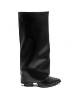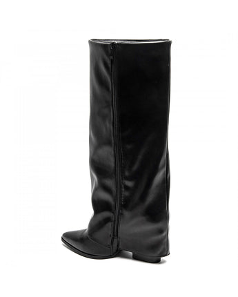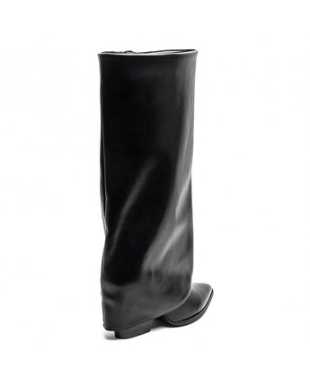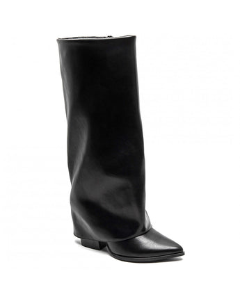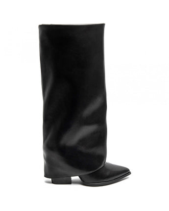 Onze Vera Omslag Boots zijn de perfecte combinatie van stijl en statement. Deze high-fashion laarzen hebben een opvallend omslagdesign dat elegant over de schacht valt, en een stevige hak van 9 cm voor die extra lengte en zelfverzekerdheid. Gemaakt van soepel PU-leer en afgewerkt met een spitse neus, maken ze van elke outfit een eyecatcher.