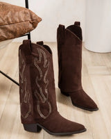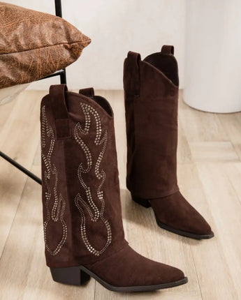 Western vibes met een trendy twist! Deze cowboy boots zijn uitgevoerd in suèdine en afgewerkt met een speels omslagdetail. De studs op de schacht zorgen voor een opvallend accent en geven de boots een edgy look. Perfect te combineren met een jurk of jeans voor een casual-chique outfit.