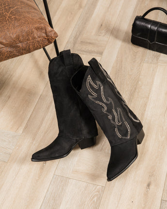 Western vibes met een trendy twist! Deze cowboy boots zijn uitgevoerd in suèdine en afgewerkt met een speels omslagdetail. De studs op de schacht zorgen voor een opvallend accent en geven de boots een edgy look. Perfect te combineren met een jurk of jeans voor een casual-chique outfit.