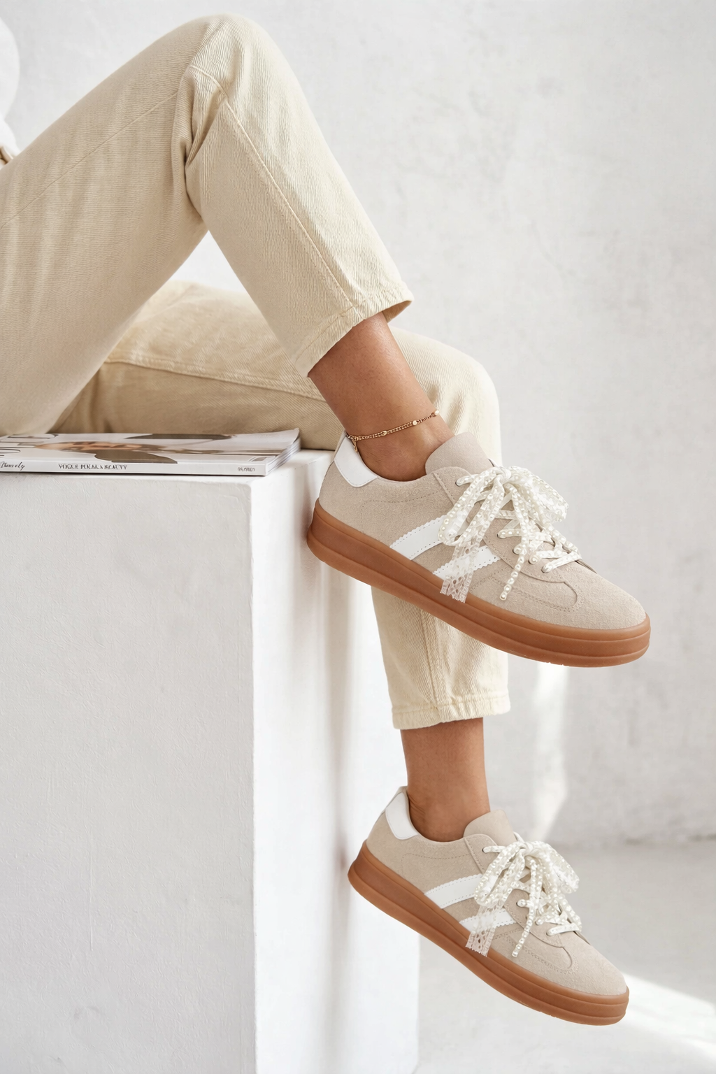 Maak kennis met de Marije Sneaker: een echte blikvanger met een speelse twist. Deze sneakers combineren zachte kleuren met opvallende details zoals kanten veters en pareltjes, voor een vrouwelijke look met een knipoog. De verhoogde zool zorgt niet alleen voor extra comfort, maar ook voor die subtiele lift die je benen net wat langer laat lijken.