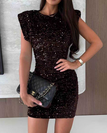 Laat jezelf stralen in de Sequin Shoulder Dress – een verfijnde mini-jurk die glamour en elegantie perfect combineert. De subtiele schoudervulling creëert een krachtige, vrouwelijke look, terwijl de pailletten je outfit laten schitteren bij elke stap.