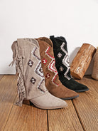 Laat je stijl spreken met de Cover Fringe Boots – een perfecte mix van boho en western vibes. De opvallende franjes en etnische borduursels geven deze laarzen een unieke uitstraling waarmee je altijd opvalt.