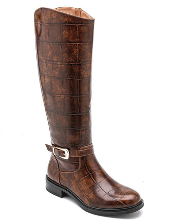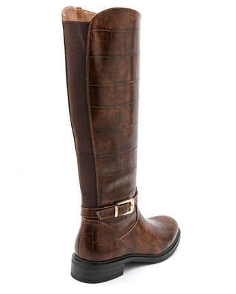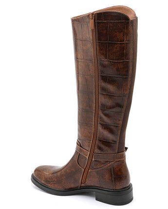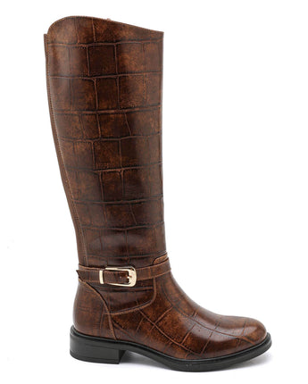 De Cro High Stretch Boots zijn een elegante en tijdloze toevoeging aan je garderobe. Gemaakt in een stijlvolle croco-look met een subtiele glans, en afgewerkt met een gouden gesp voor een verfijnde uitstraling. De achterzijde is voorzien van een elastische stretchband, waardoor deze laarzen perfect zijn voor vrouwen met bredere kuiten. Comfort en stijl komen hier prachtig samen.