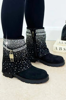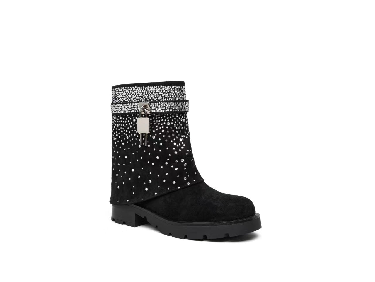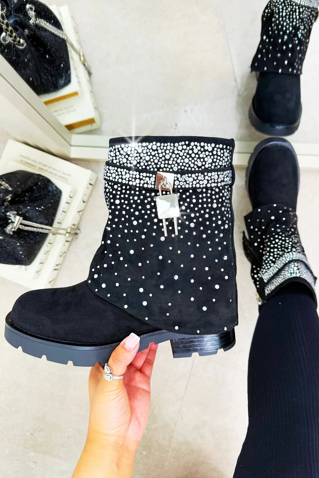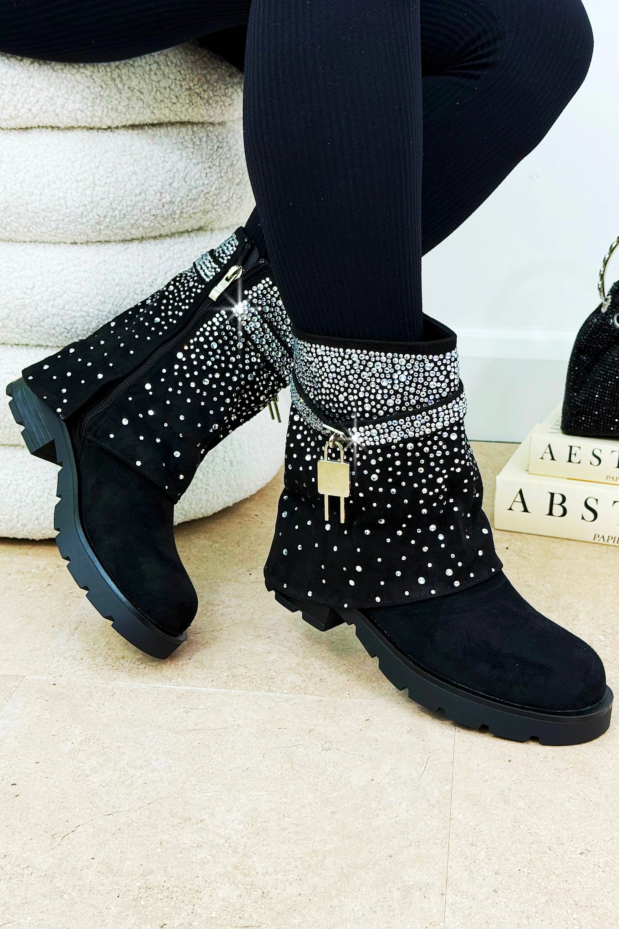 De Sparkle Lock Black Boots zijn een echte eyecatcher! Volledig bedekt met fonkelende steentjes en afgewerkt met een decoratief hangslotje, geven deze boots elke outfit een glam update.