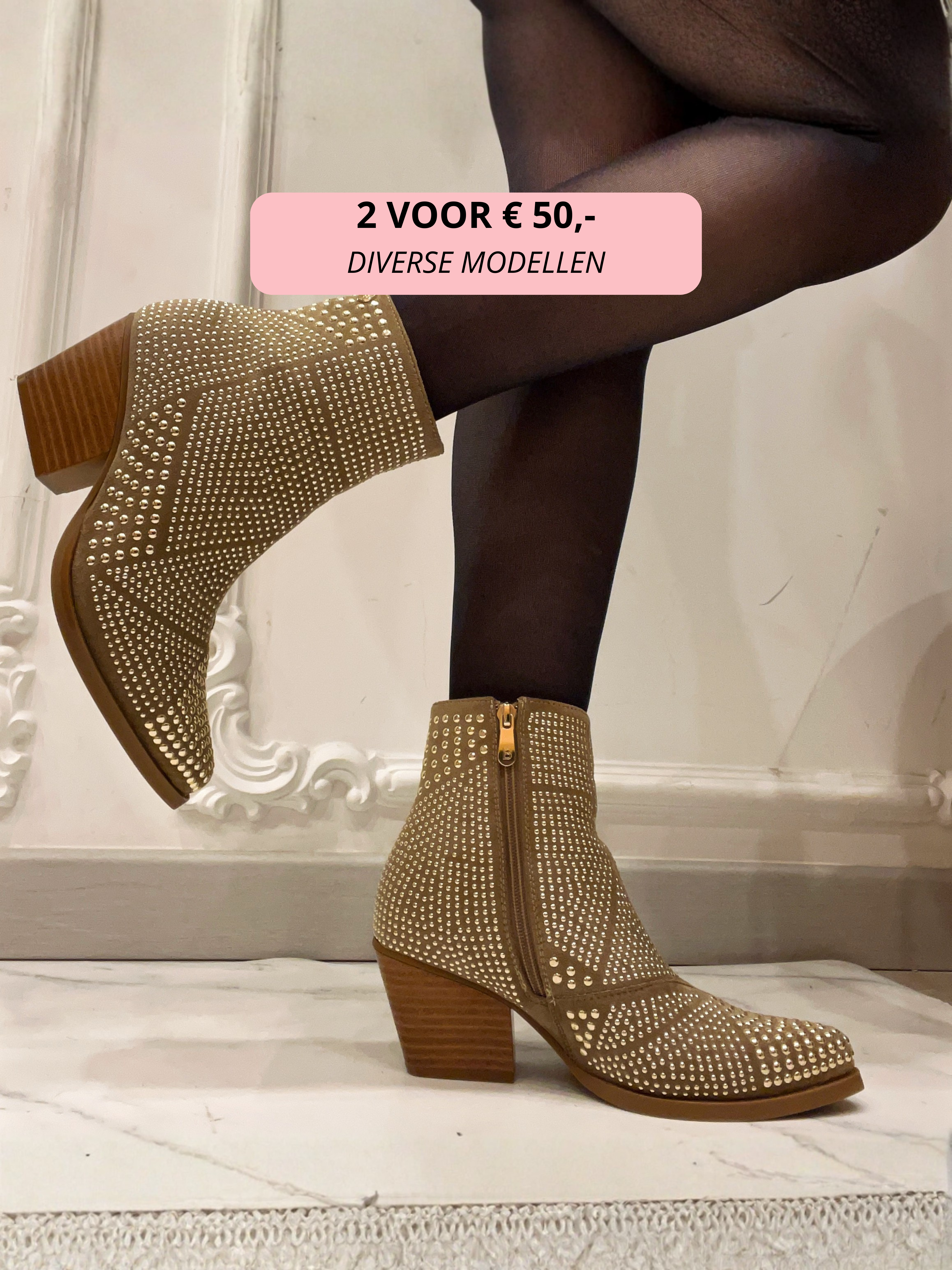 Maak een statement met deze stoere enkellaarzen vol goudkleurige studs! Ze geven elke outfit een edgy, vrouwelijke touch. En het mooiste van alles? Ze doen mee aan onze 2 paar voor €50,- actie!