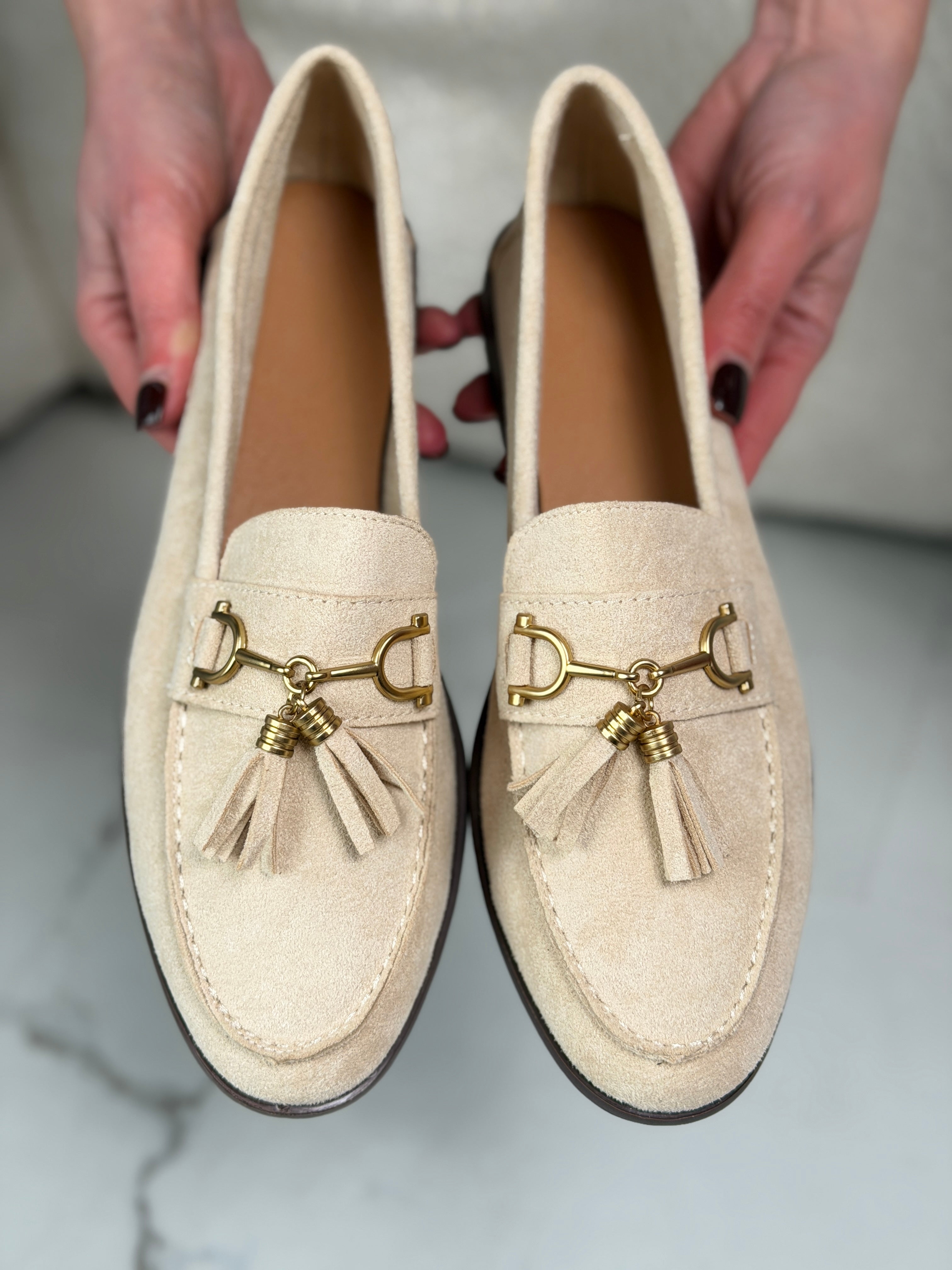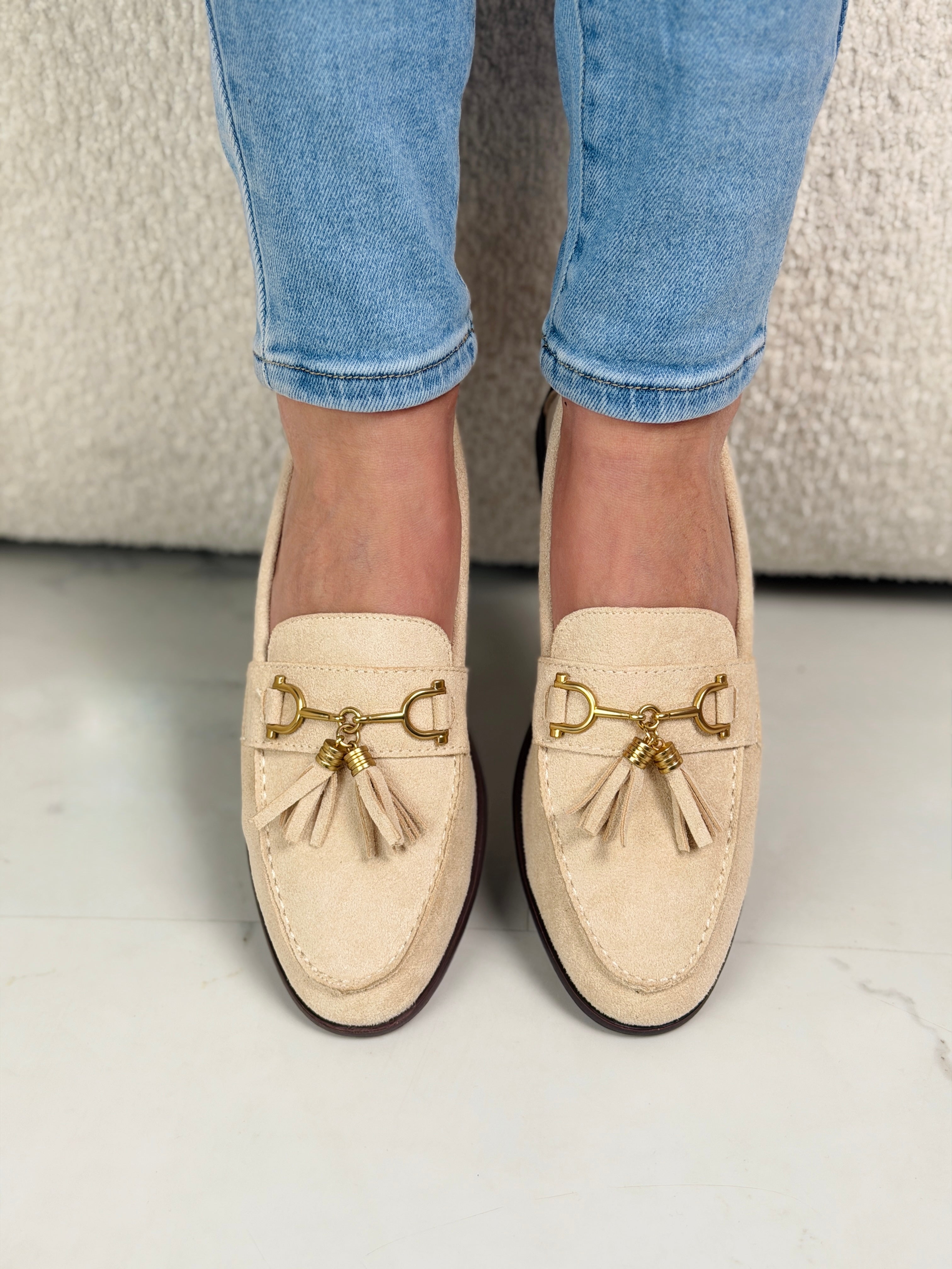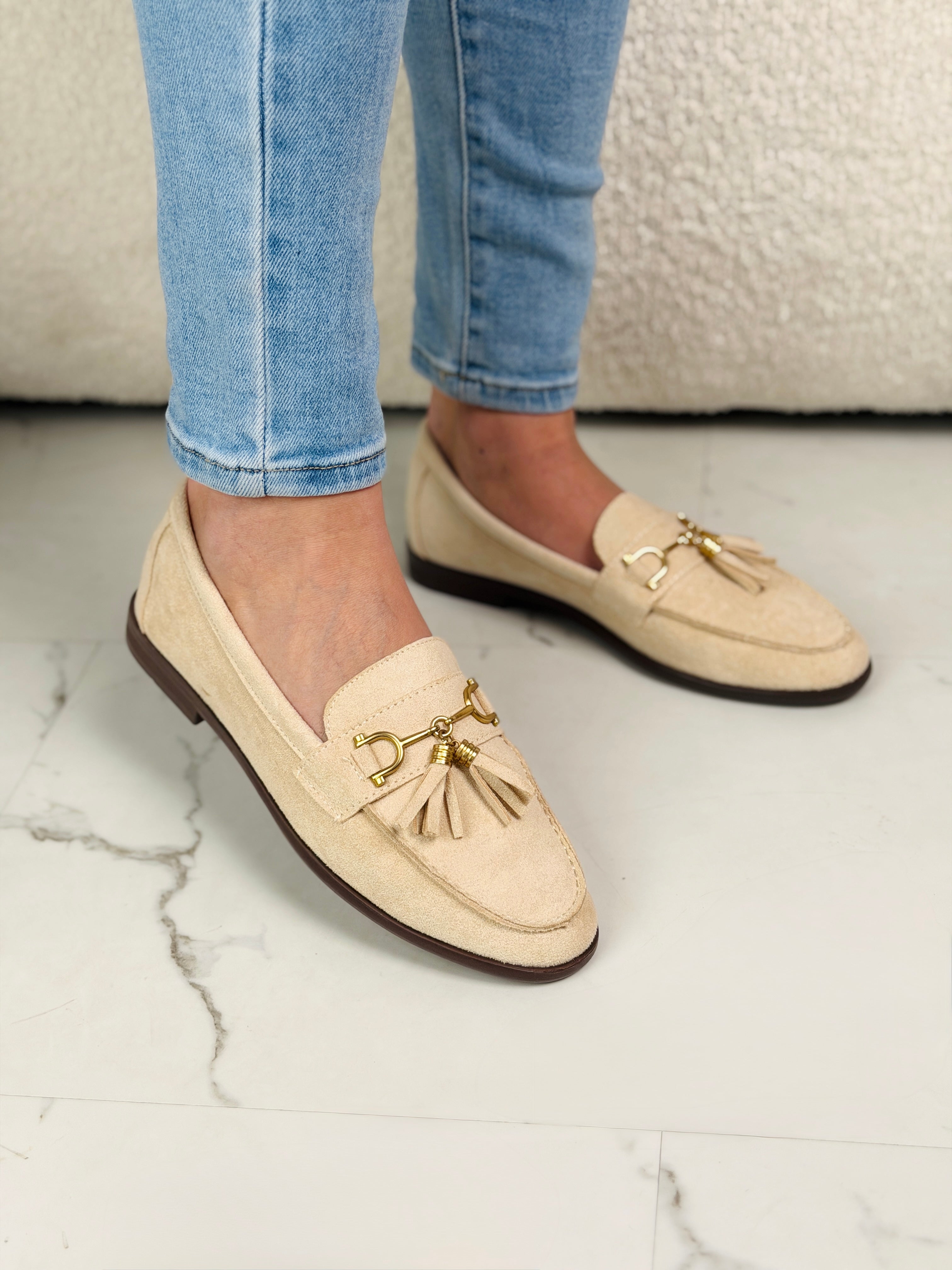De Nena Loafers zijn de perfecte combinatie van elegantie en comfort. Deze stijlvolle instappers zijn gemaakt van zacht suedine en afgewerkt met een chique goudkleurig detail en speelse tassels op de wreef. Ideaal om elke outfit net dat beetje extra te geven – van casual tot classy.