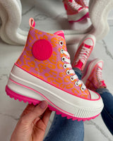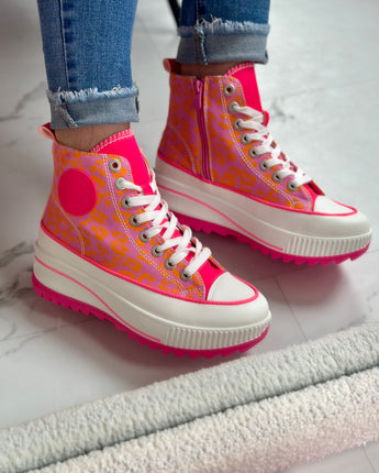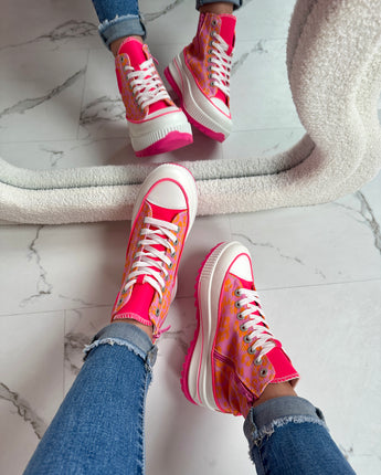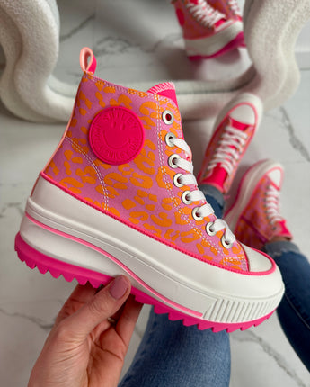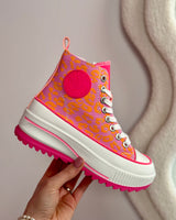 DE MUST-HAVE VOOR DIT NAJAAR! Het afgelopen jaar was dit één van onze bestsellers, en dat kunnen wij goed begrijpen! Super leuke half hoge fuchsia sneakers, de oranje details maken de sneakers helemaal af! Door het hogere model ervaar je meer comfort en steun om de enkels. De opdruk van het embleem is: ' SMILE - HAVE A SMILEY DAY' De quote maakt deze schoenen helemaal af.