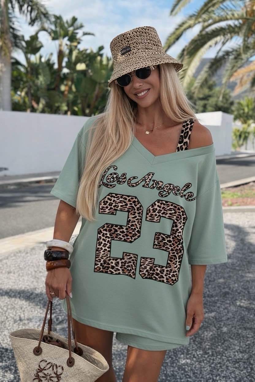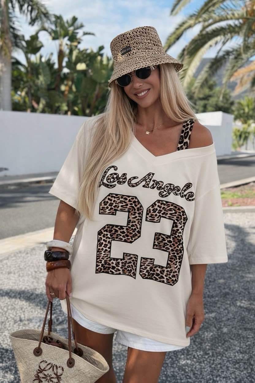 De V-hals en de opvallende leopard print met “23” detail maken dit shirt net even anders. Ideaal voor een casual dag, vakantie of gewoon wanneer je iets makkelijks maar leuks wilt dragen.