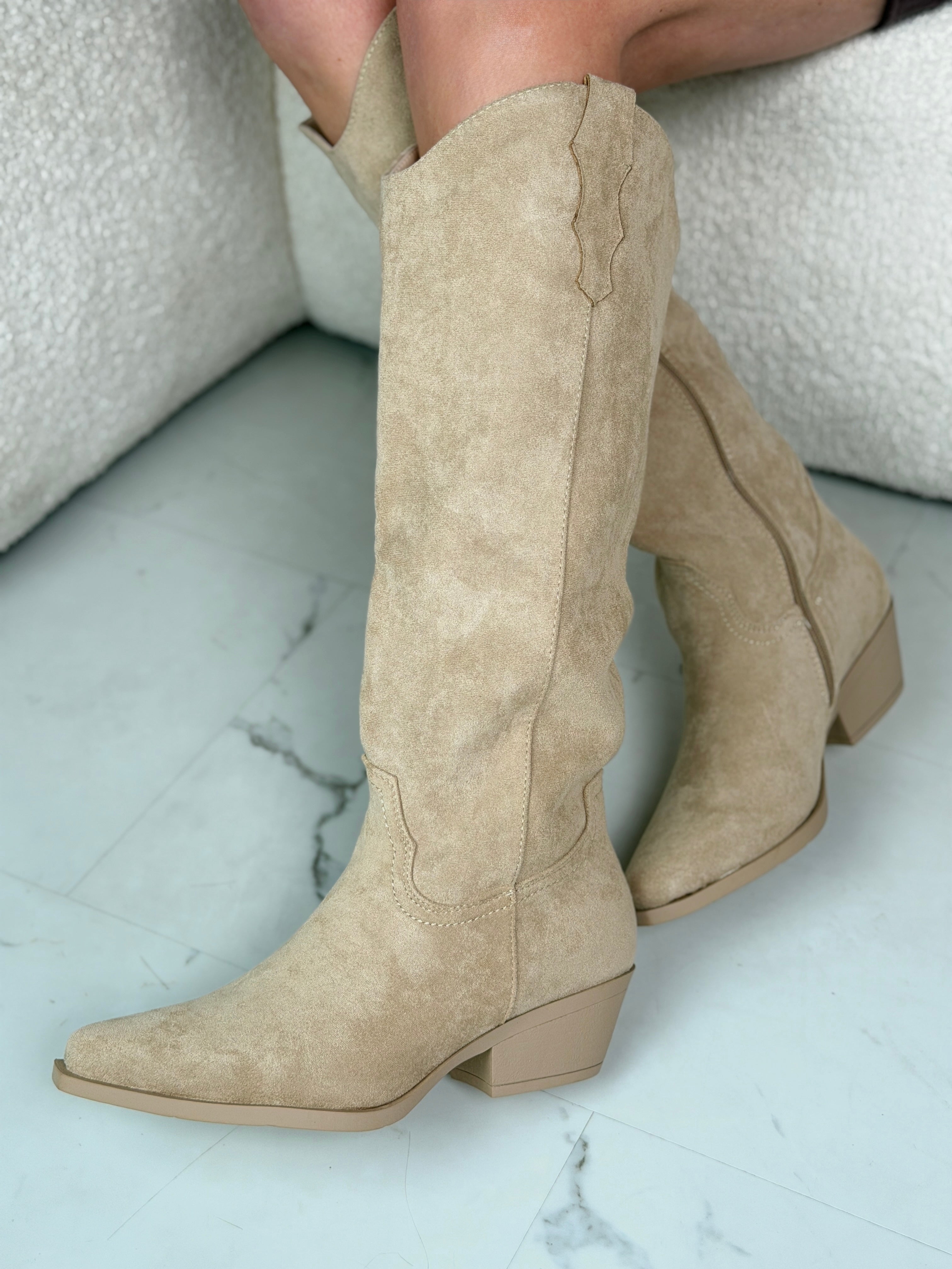 Die Tall Western Boots vereinen klassischen Western-Style mit modernem Tragekomfort. Aus hochwertigem Suedine gefertigt und mit einem 4 cm Absatz versehen, sind sie perfekt für Alltagslooks und elegante Outfits.