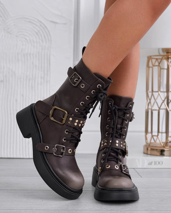 Treffen Sie die Arianne Bikerboots - cool, stilvoll und unwiderstehlich trendig. Diese Stiefel bestehen aus robustem PU -Leder mit Metalldetails und Schnallen für einen kantigen Look. Dank der Schnürung und Reißverschluss an der Seite können Sie sie mühelos anziehen. Die robuste Sohle mit einer bequemen Fersenhöhe von 5,5 cm und einem 3,5 -cm -Plateau bietet Ihnen diese kleine zusätzliche Höhe, ohne den Komfort zu geben.