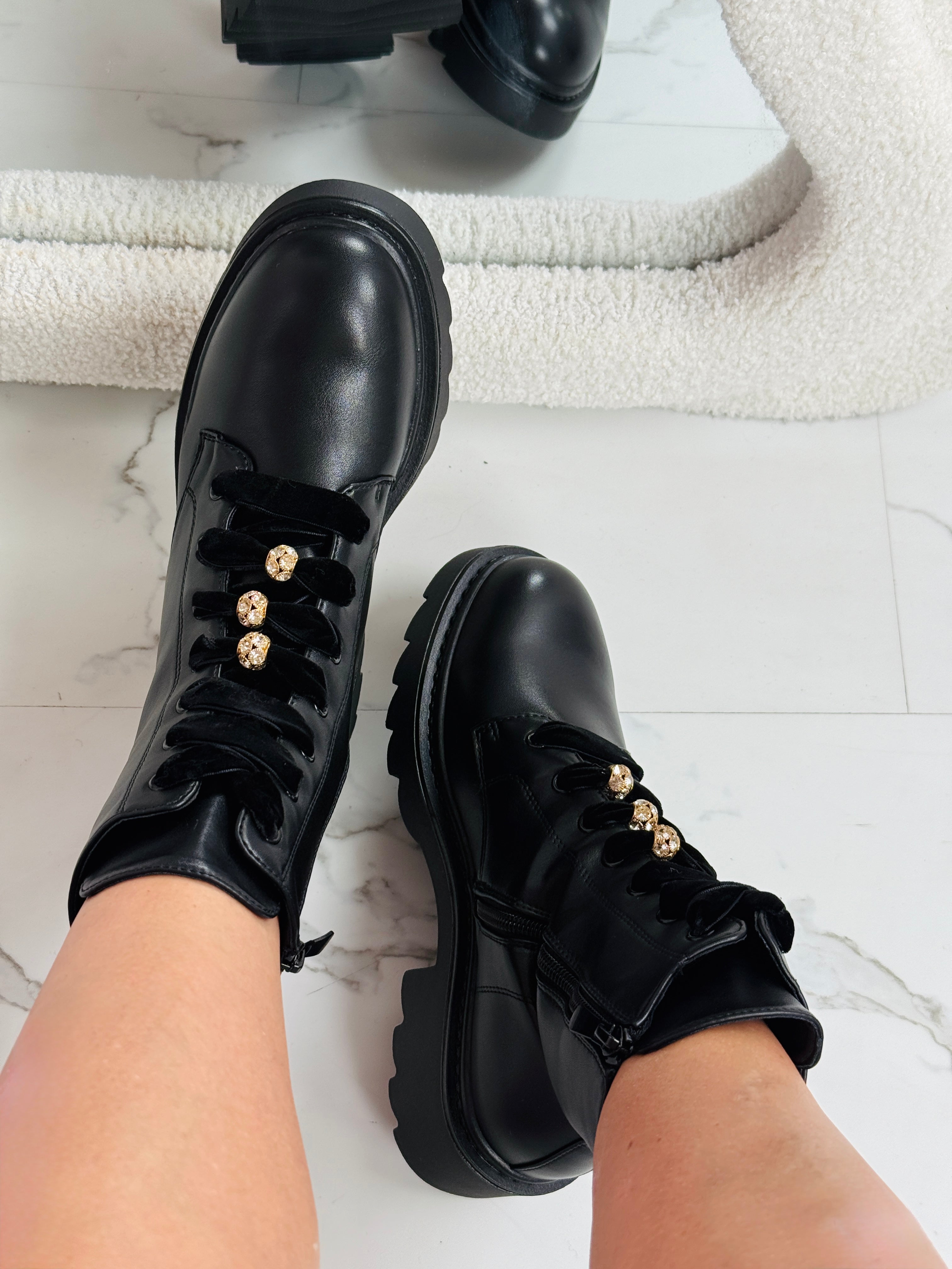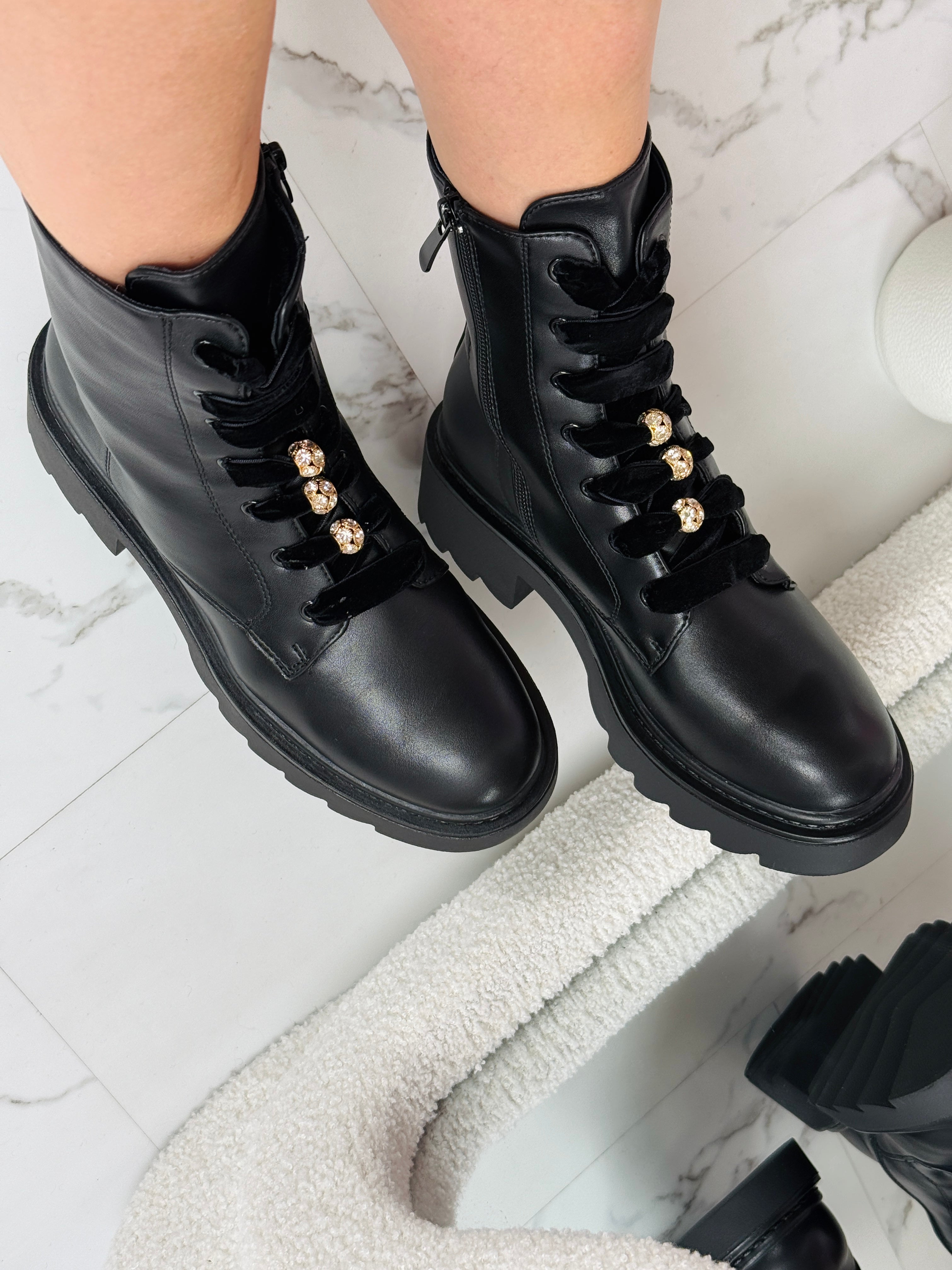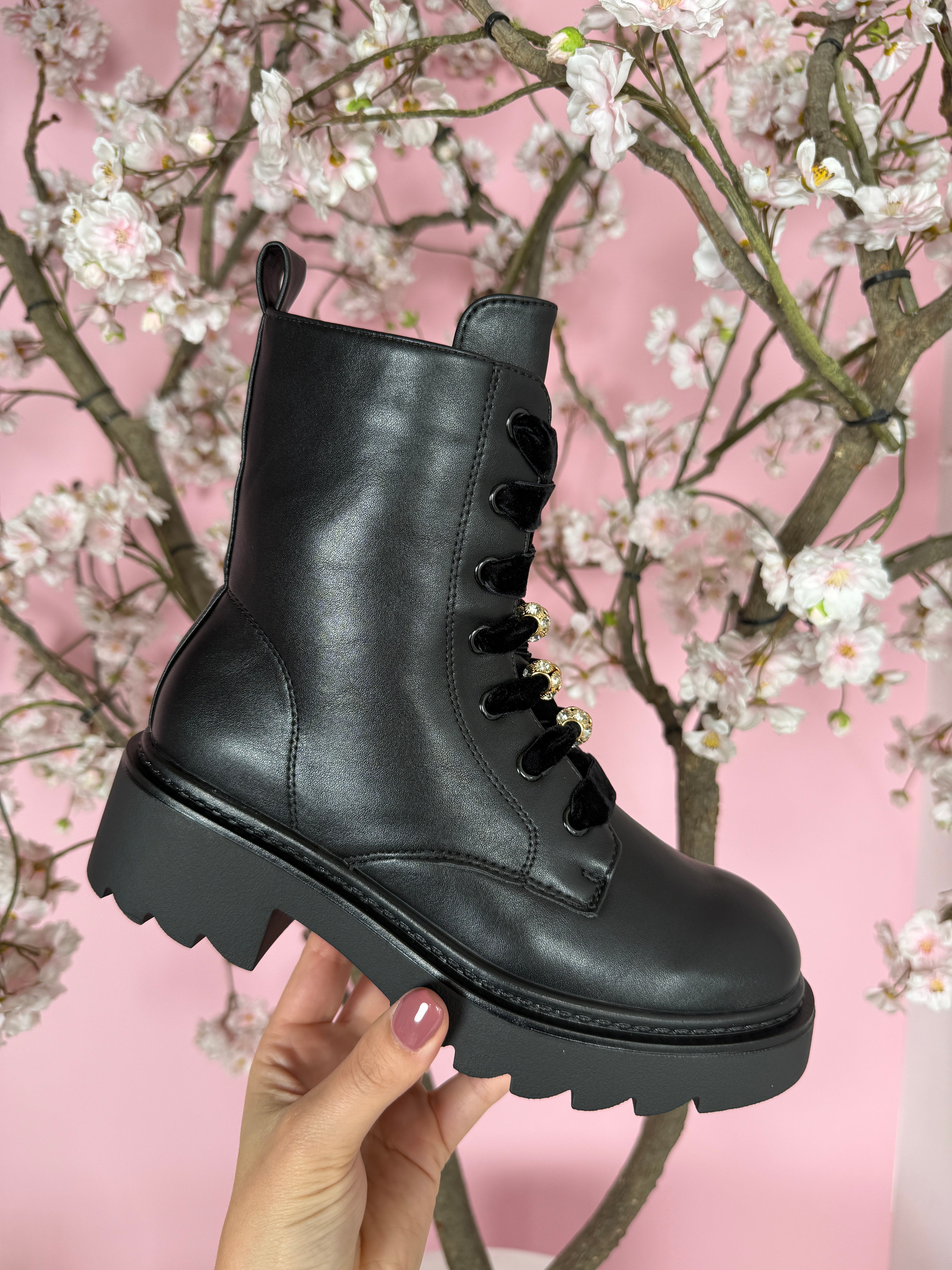 Die Luna Lace Boots vereinen robusten Chunky-Look mit romantischen Details: Samtschnürsenkel und zarte Schmucksteine machen sie zum absoluten Statement-Piece.