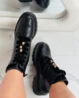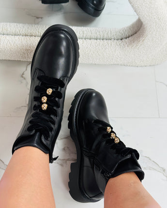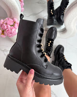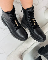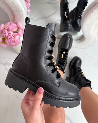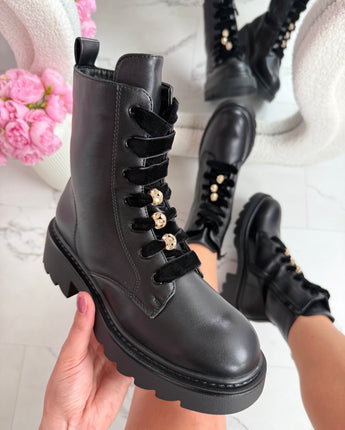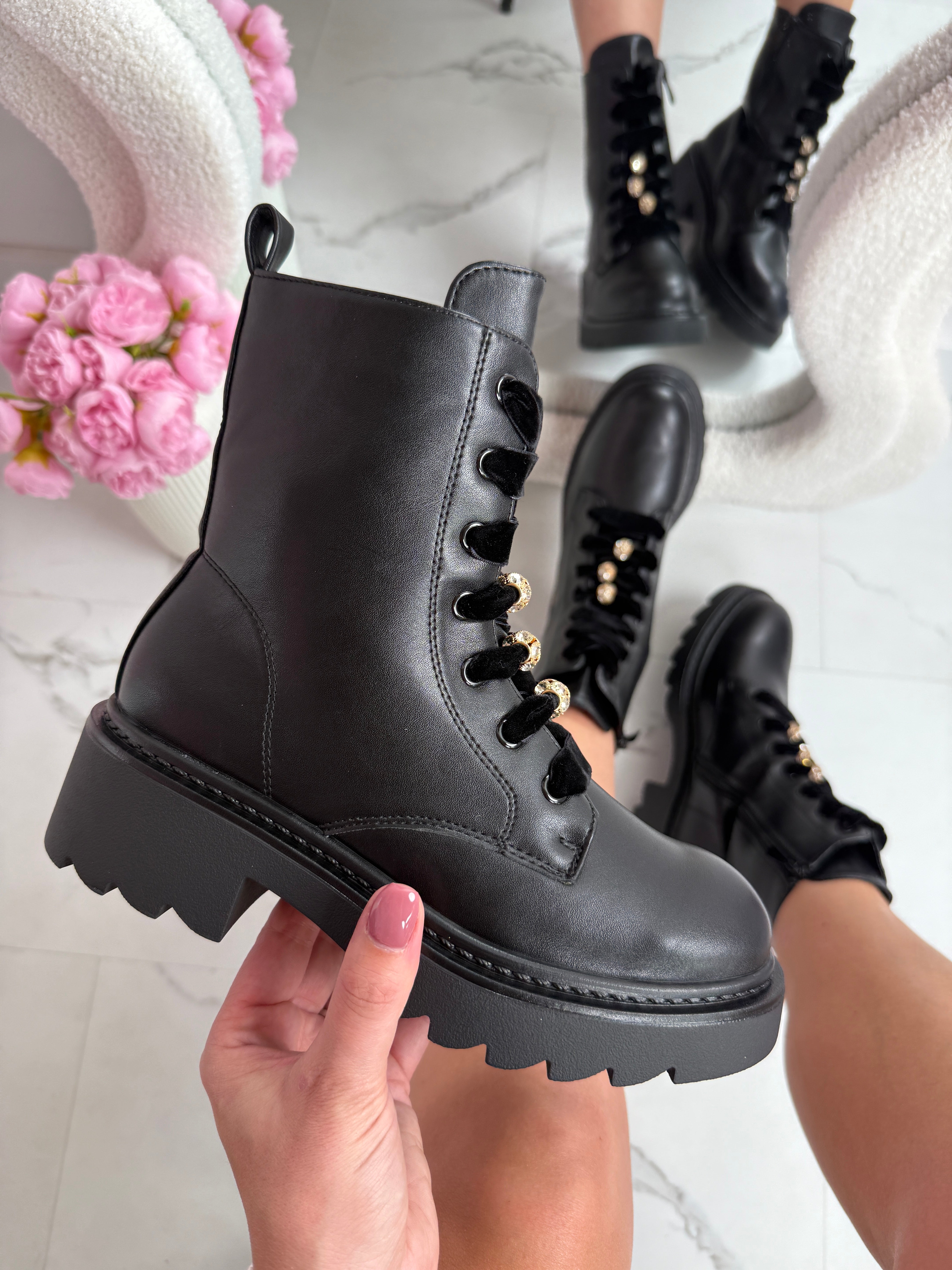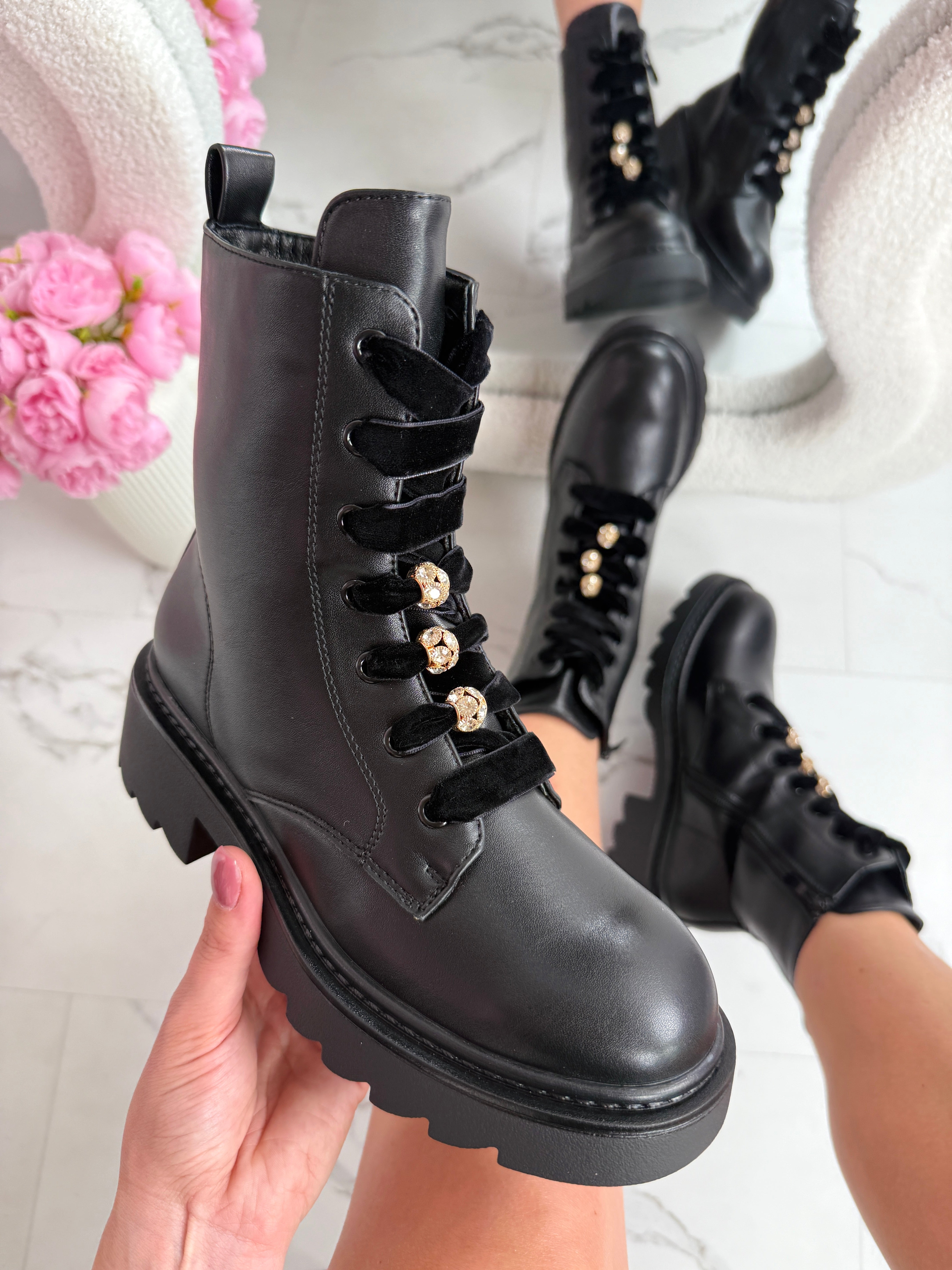 Die Luna Lace Boots vereinen robusten Chunky-Look mit romantischen Details: Samtschnürsenkel und zarte Schmucksteine machen sie zum absoluten Statement-Piece.