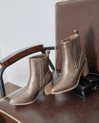 Unsere Monika Boots sind stilvoll und modern – gefertigt aus nachhaltigem PU-Leder in den Farben Schwarz und Gold. Mit einem komfortablen Blockabsatz von 7 cm und einer Schafthöhe von 14 cm ideal für den Herbst 2025 – stylisch und alltagstauglich.