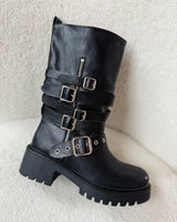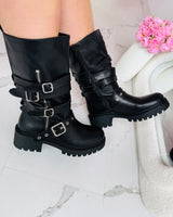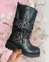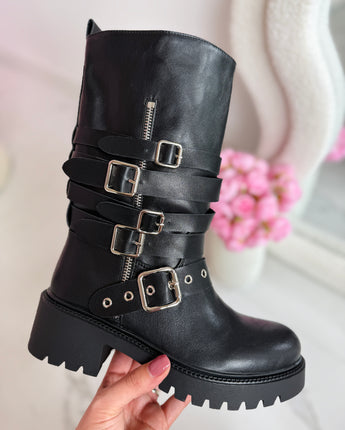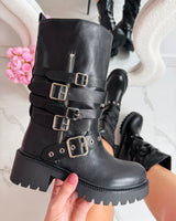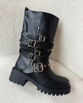 Die Tahira Black Boots sind dein neues Must-have für einen markanten und stylischen Auftritt. Mit robuster Profilsohle, auffälligen Schnallen-Details und einem praktischen Reißverschluss an der Innenseite vereinen sie Komfort mit einem edgy Look.