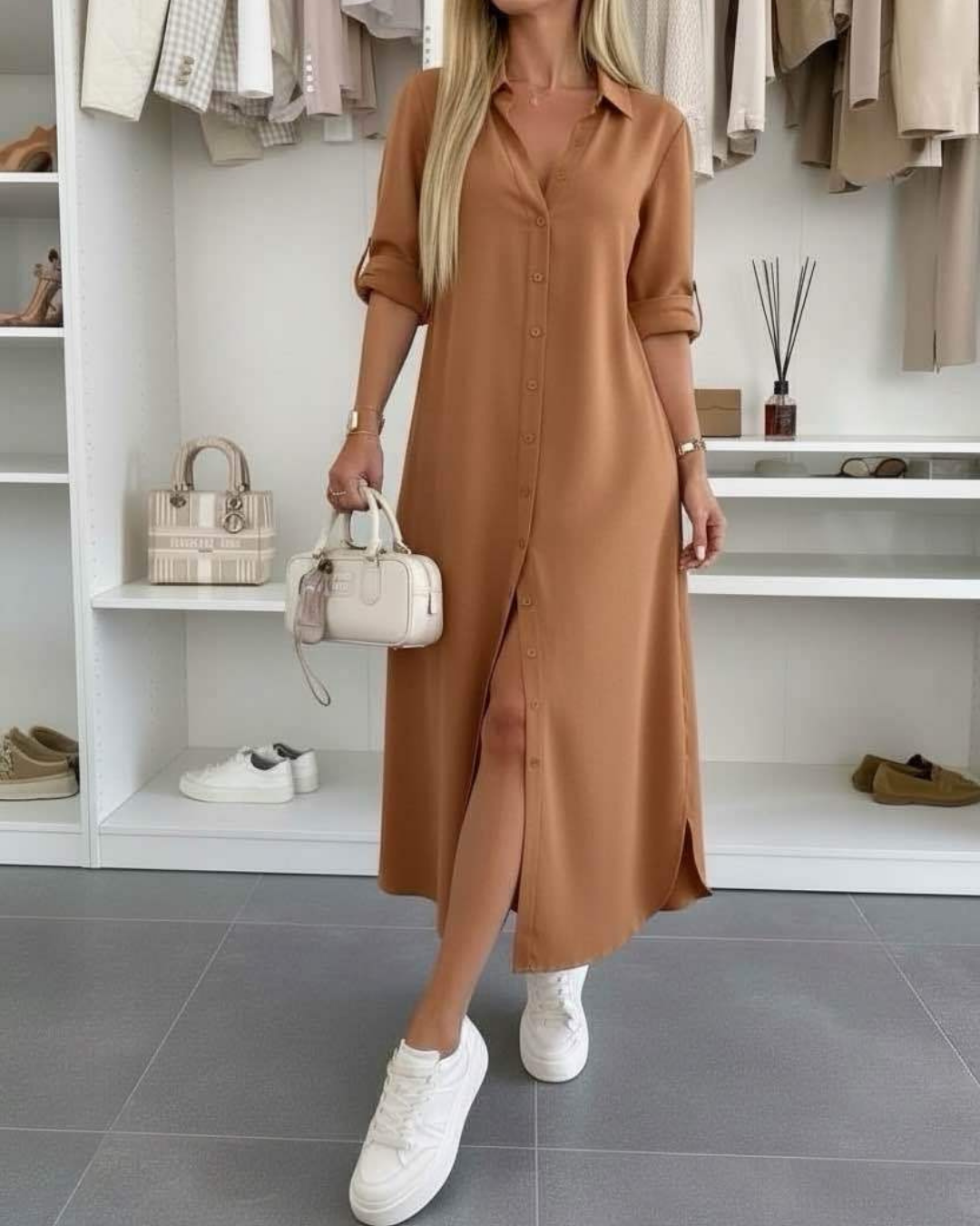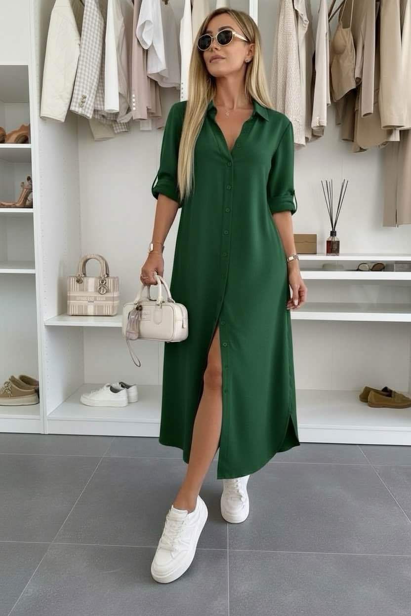 Das Modell verfügt über einen klassischen Kragen, eine durchgehende Knopfleiste und hochgekrempelte Ärmel für einen lässigen Look. Trage es sportlich mit Sneakers oder kombiniere es mit Absätzen für ein eleganteres Outfit. Dank des fließenden Stoffes fällt das Kleid wunderschön am Körper.