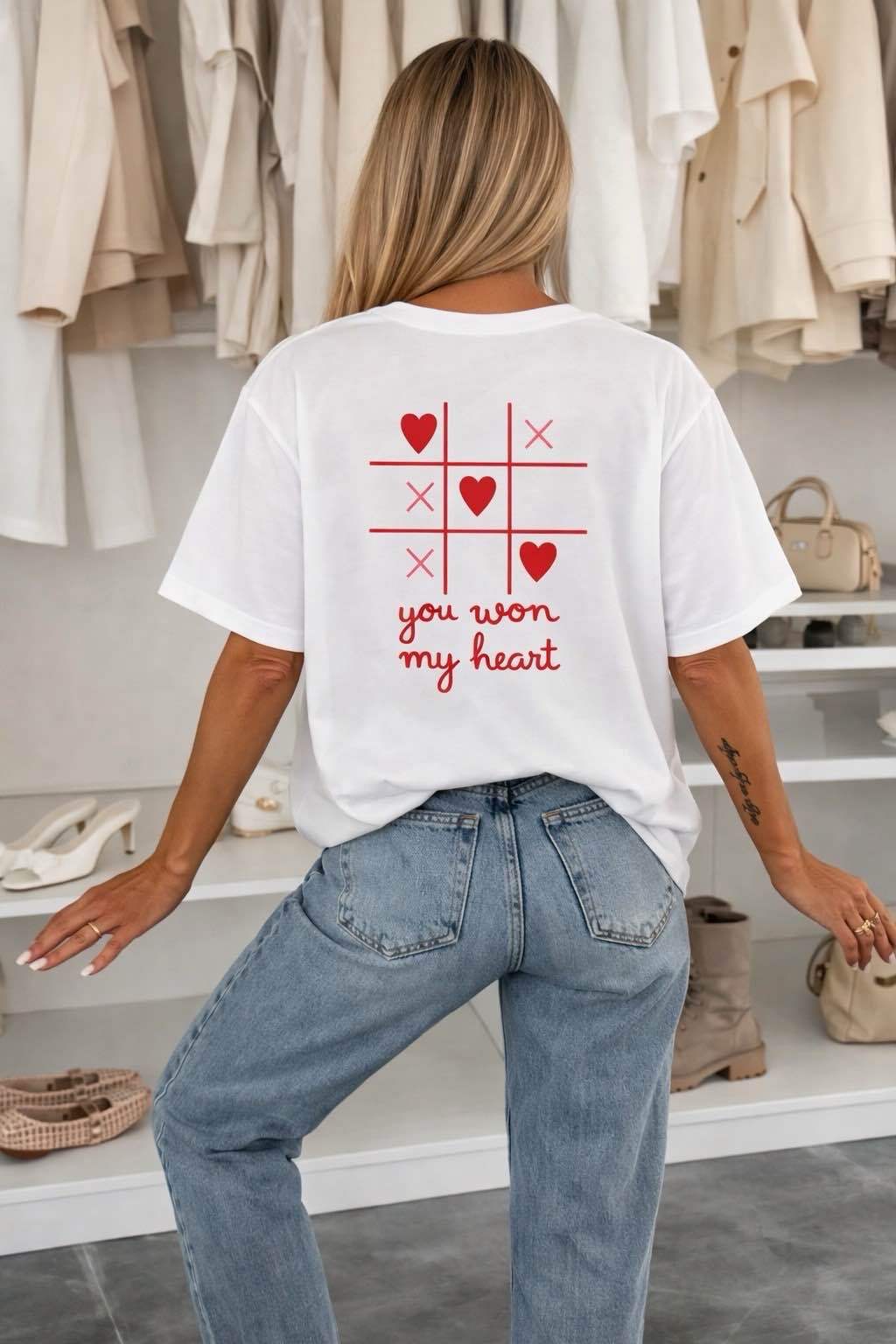 Dit leuke T-shirt heeft een opvallende print met hartjes en de tekst “you won my heart”, wat zorgt voor een speelse en romantische uitstraling. De zachte en elastische stof maakt het shirt heerlijk comfortabel om te dragen. Perfect te combineren met jeans, shorts of een rok.