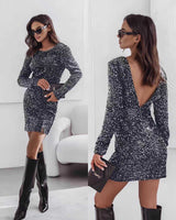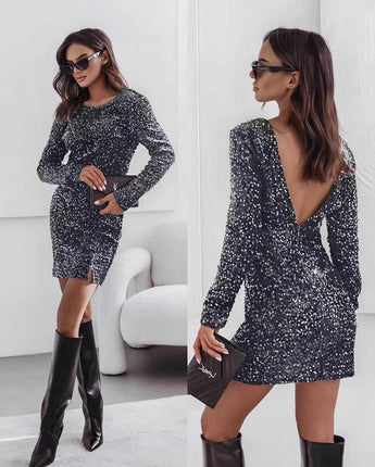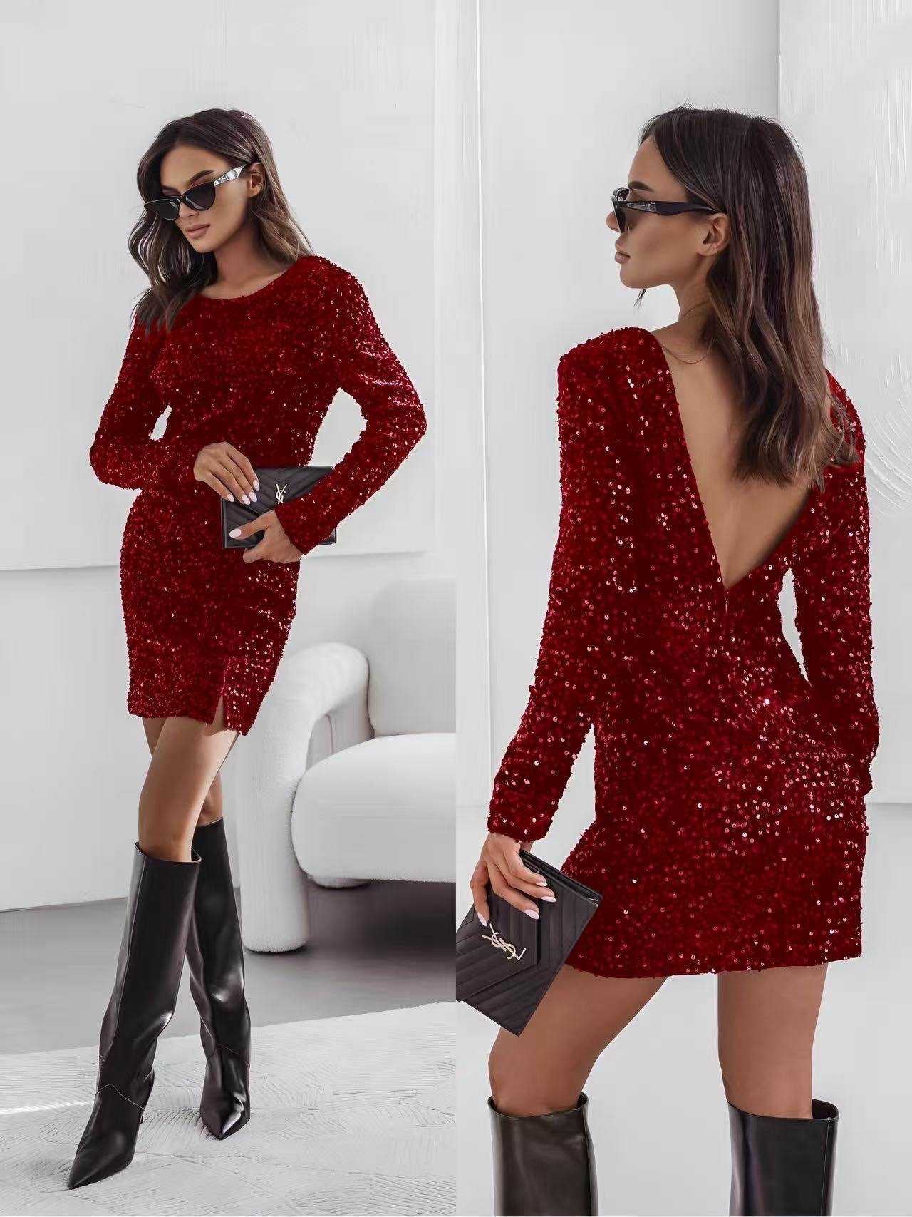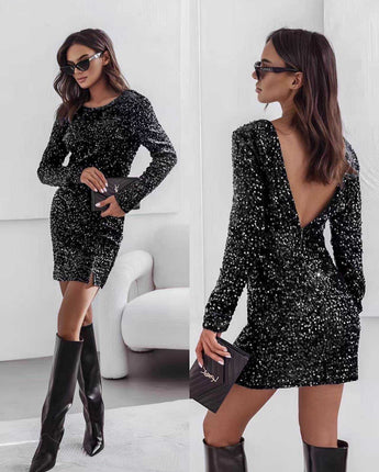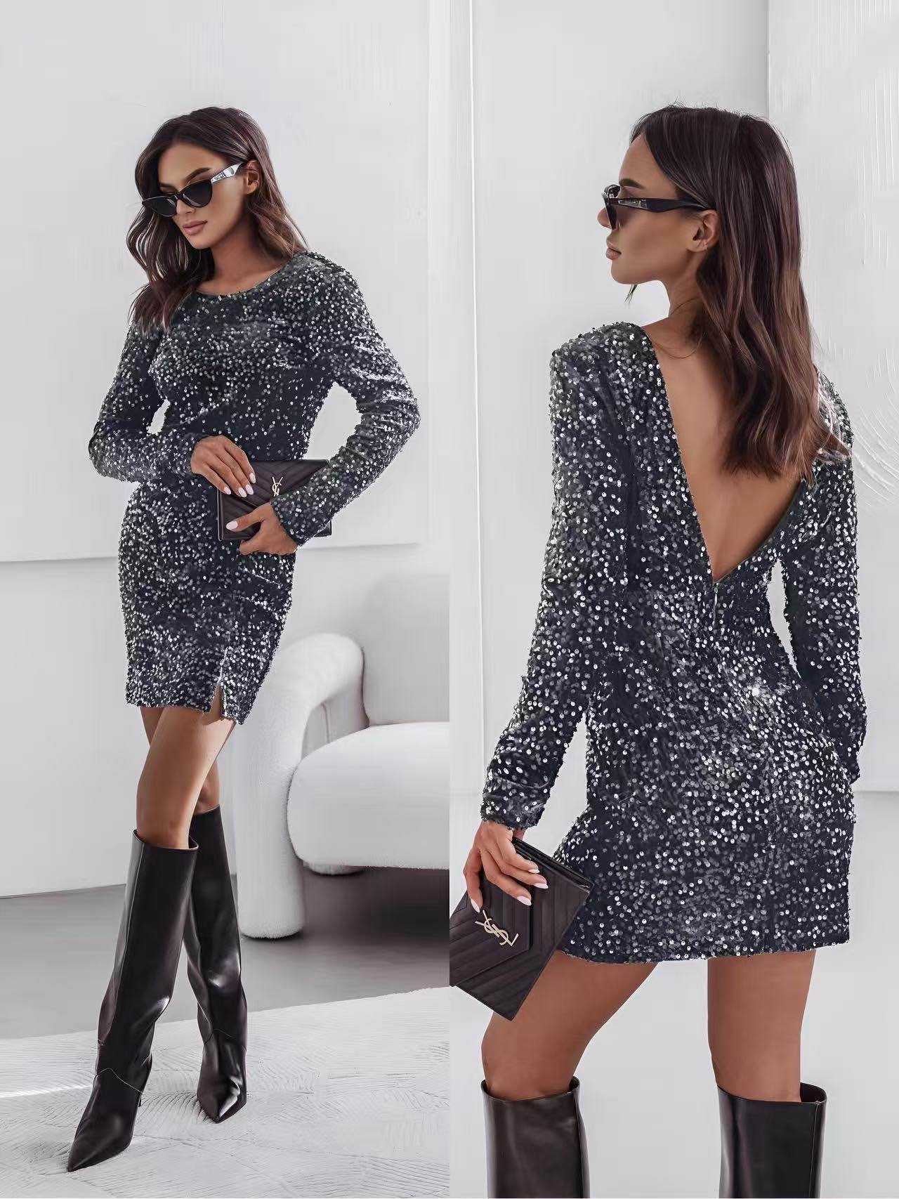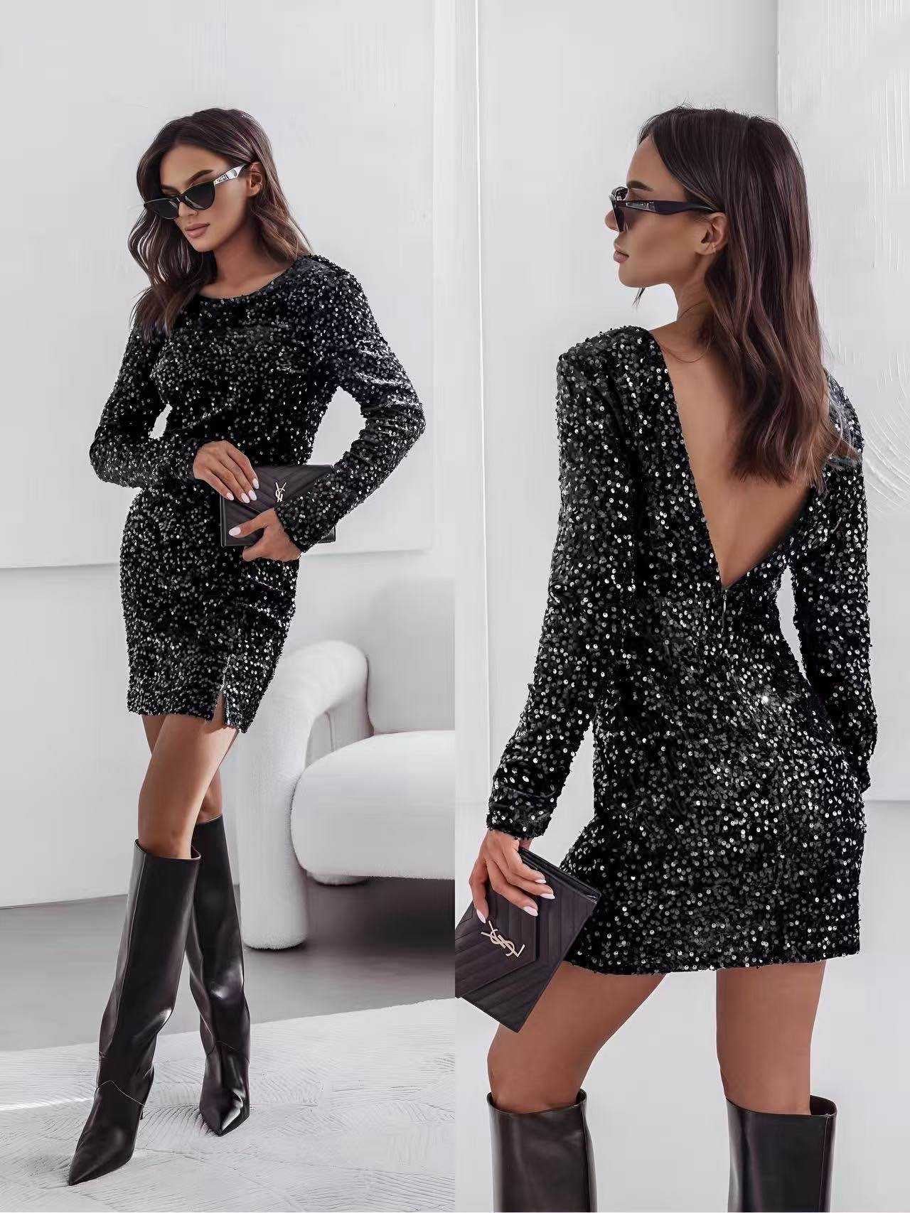 The Open Back Dress is a glamorous, eye-catching piece featuring shimmering sequins and a bold open back. Designed with stretch fabric, it offers a flattering fit without compromising comfort.