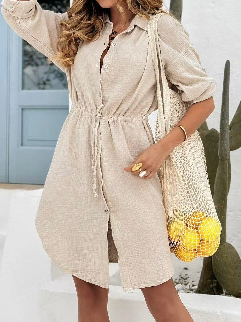 ✔ Made from 100% breathable cotton ✔ Waist tie for a flattering silhouette ✔ Practical and stylish for warm days ✔ Available in beige, blue, pink, and yellow