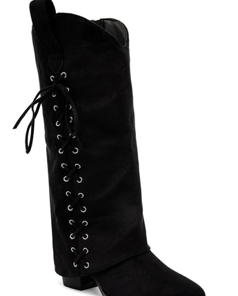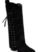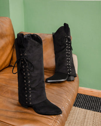 The Cover Lace Boots are a true statement piece with their bold lace-up detail running across the shaft. These boots blend western flair with feminine style. Crafted from soft faux suede and set on a sturdy 6 cm block heel for added height and comfort. Easy to slip on and off thanks to the inner side zipper. Available in black and beige.