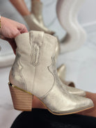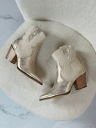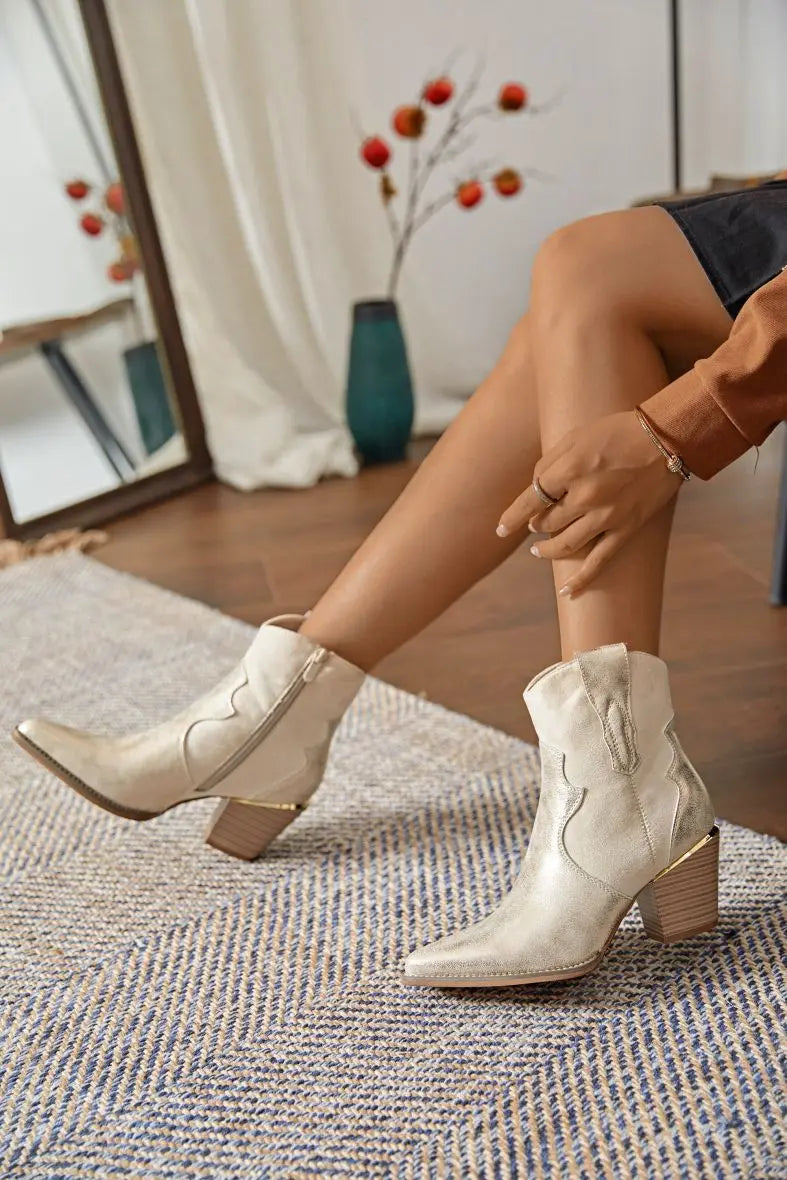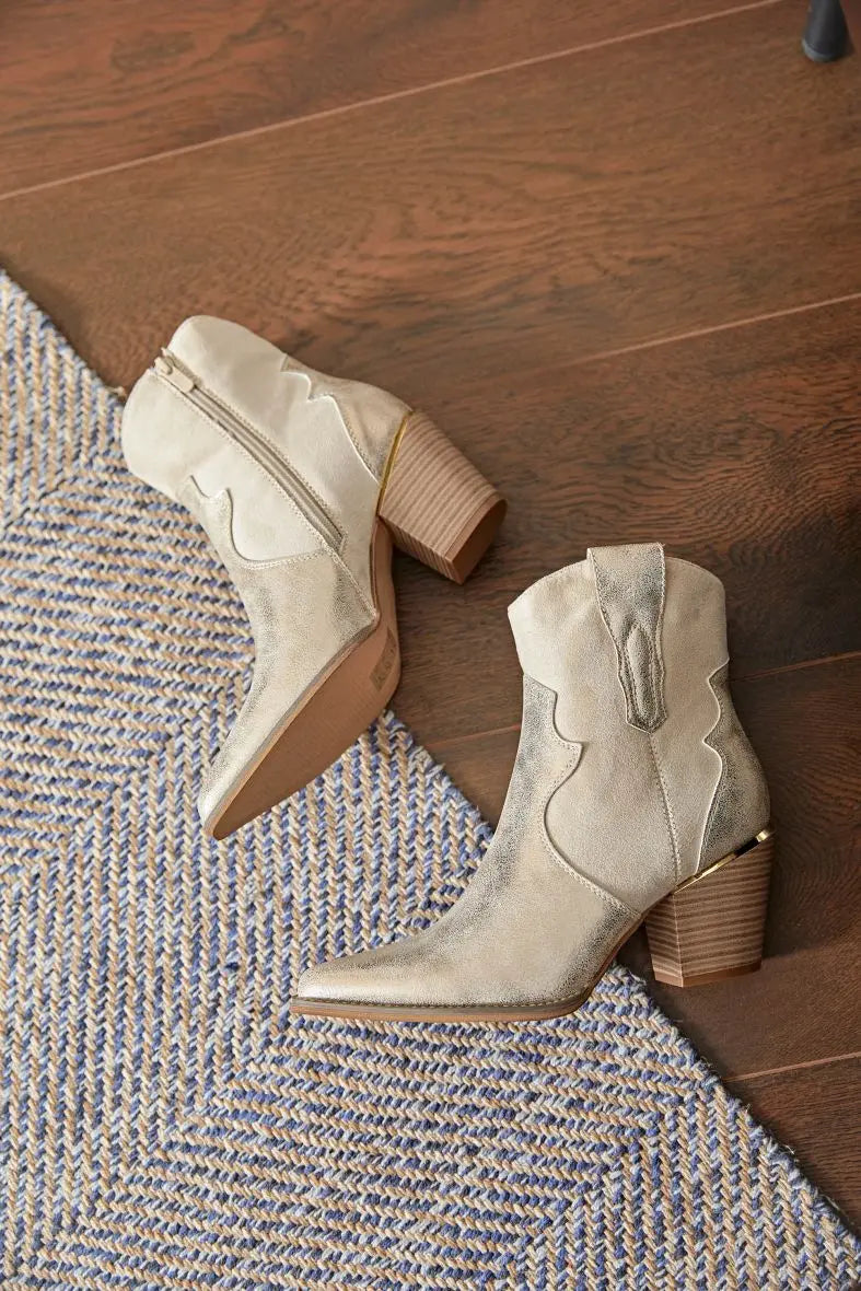 The Giavanna Gold Boots are a true standout piece with their shimmering finish, subtle western vibe, and gold heel accents. Made from high-quality vegan leather, these boots feature a comfortable 6.5 cm block heel — elegant yet wearable.