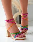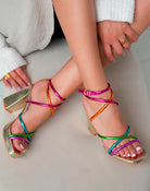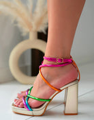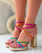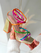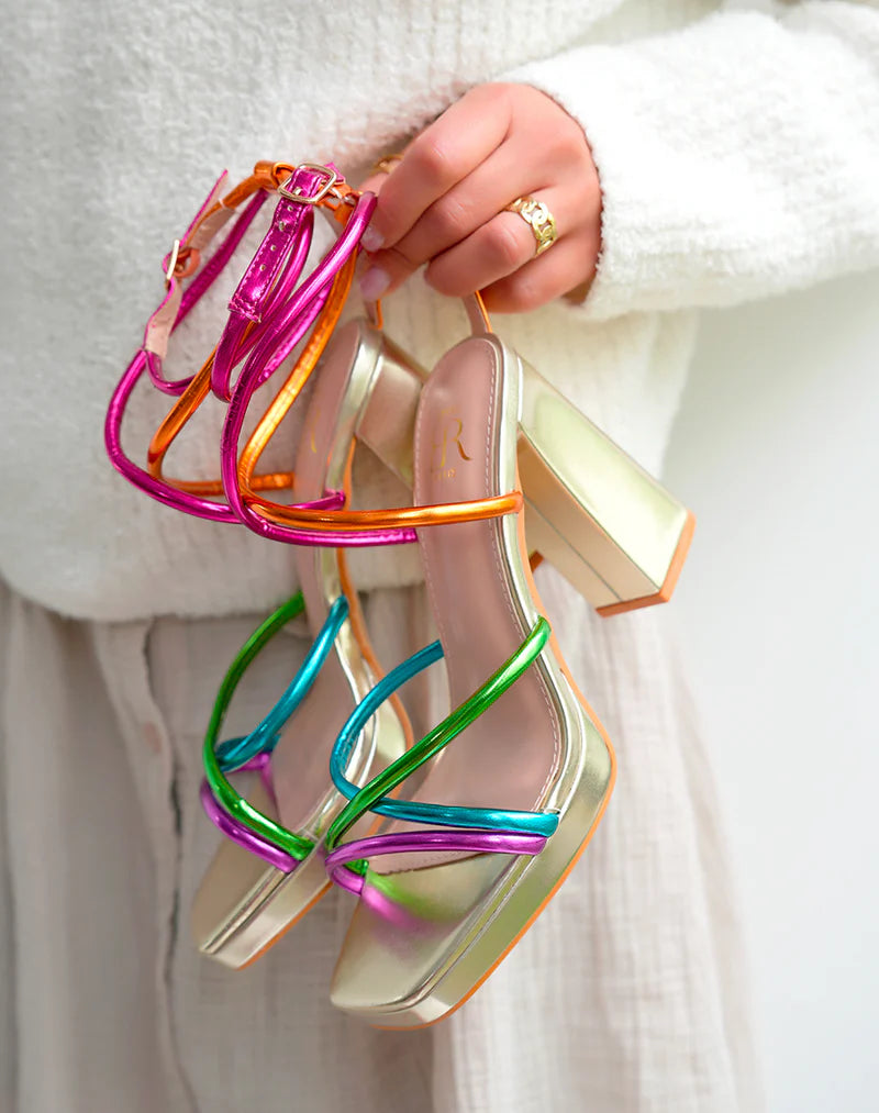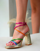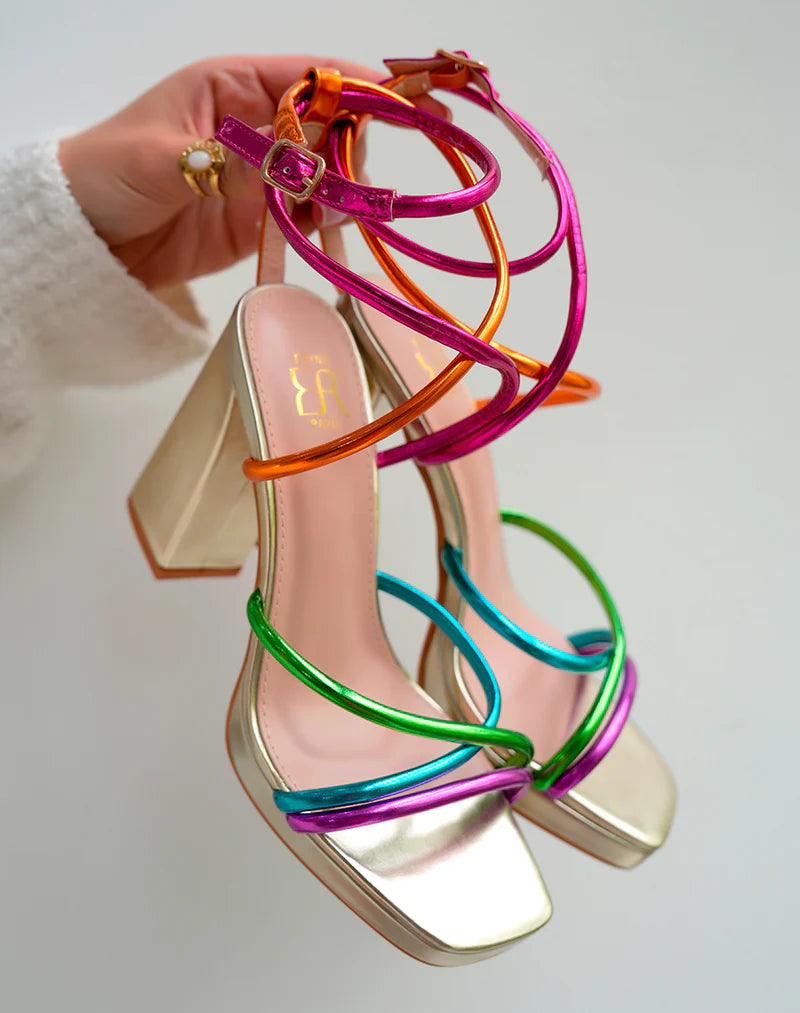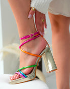 Add a pop of color to your wardrobe with these trendy golden heels! Featuring multicolor straps in pink, orange, green, blue, and purple, our "Vivian Heels" will give your outfit a cheerful and stylish touch!