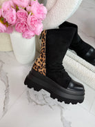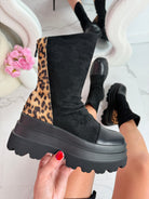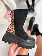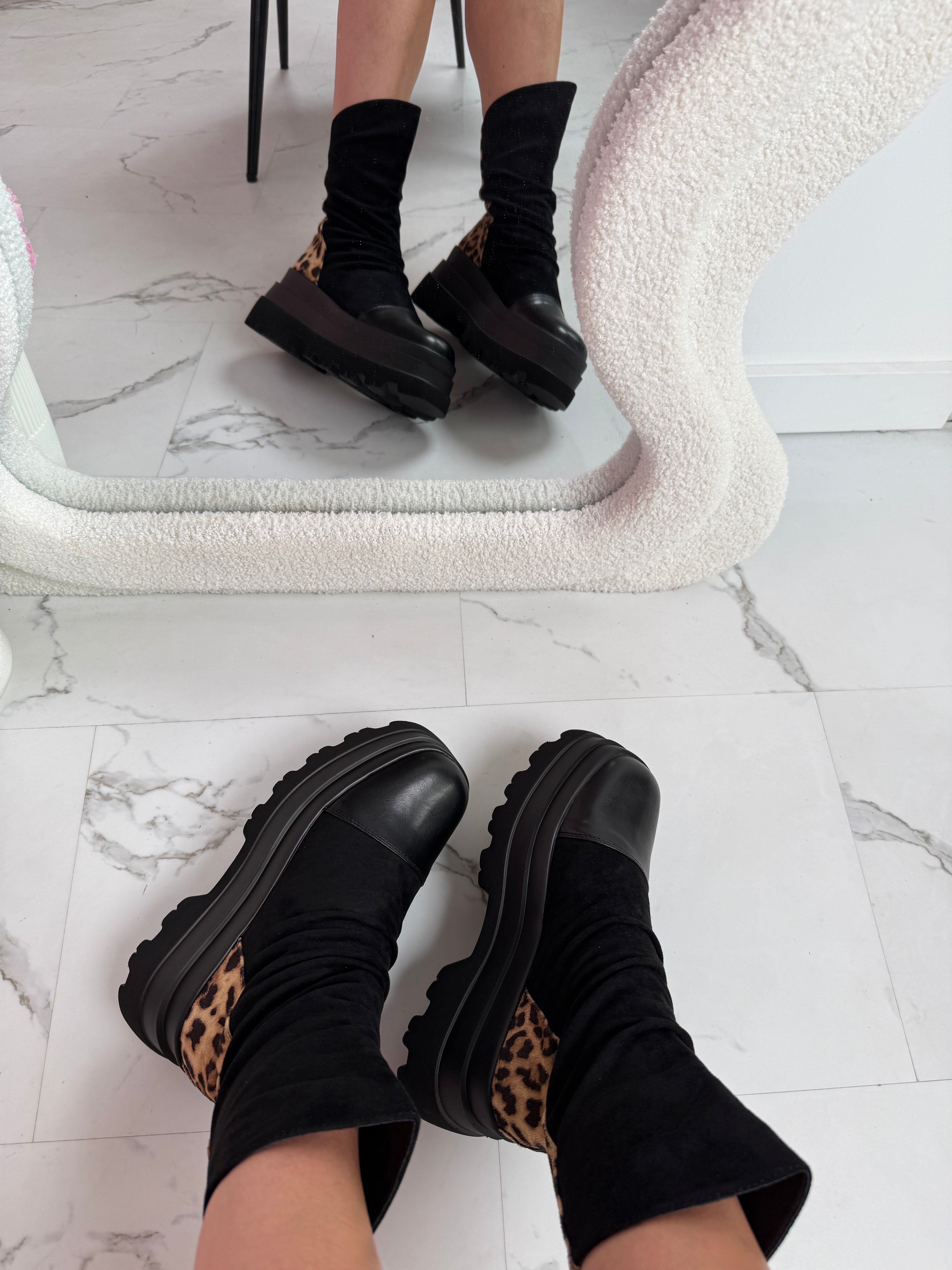 Les Zenya Boots sont de véritables pièces maîtresses pour celles qui aiment un style moderne et audacieux. Ces bottes associent une semelle plateforme épaisse à un design unique : disponibles en noir uni ou avec un détail léopard original à l’arrière.