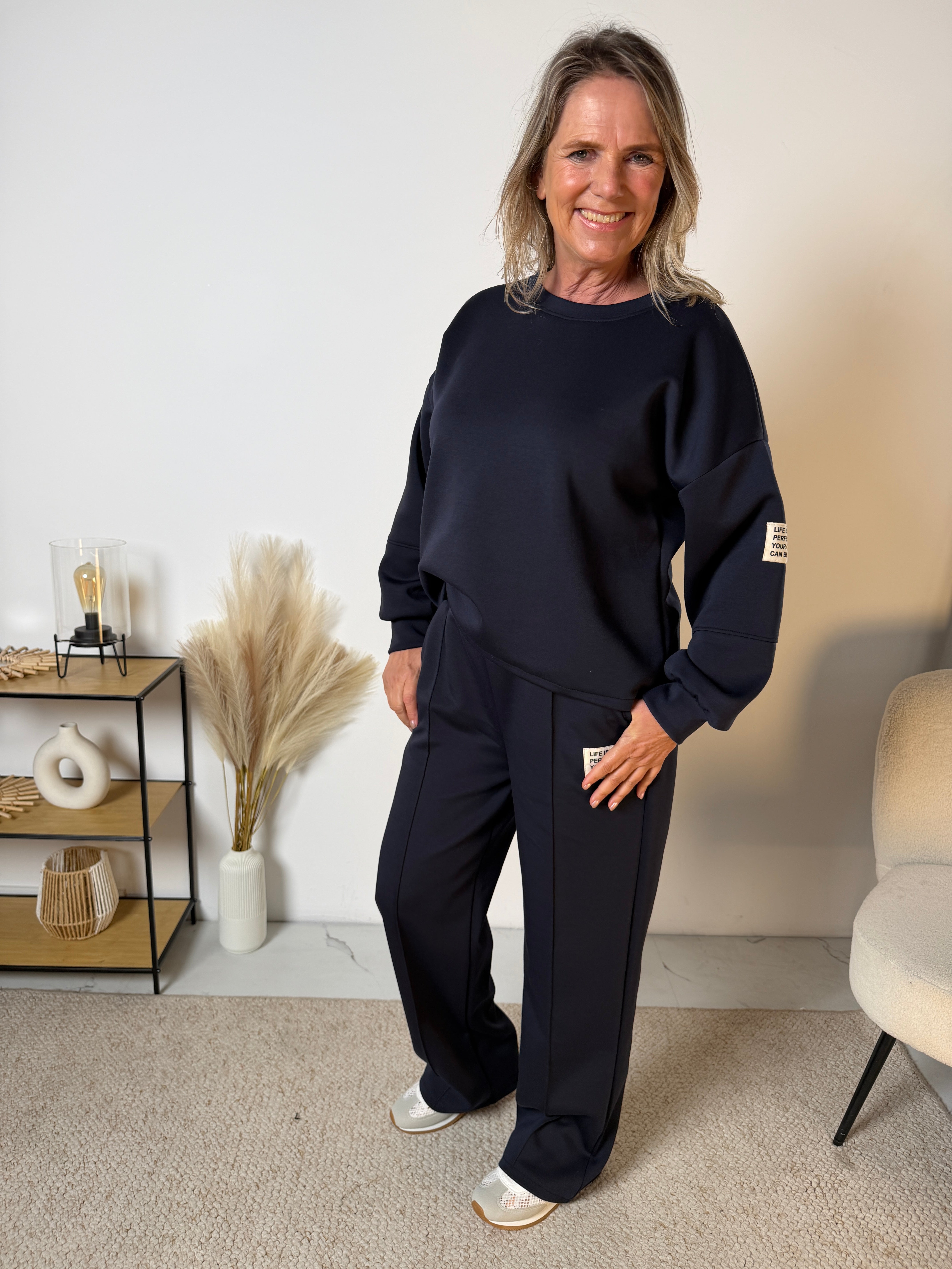 Le pull présente une coupe ample avec une ligne d’épaules large, offrant une allure moderne et décontractée. Le pantalon est agréable à porter et tombe parfaitement grâce à sa jambe droite et sa longueur confortable. Idéal pour la maison, les sorties ou une journée détente.