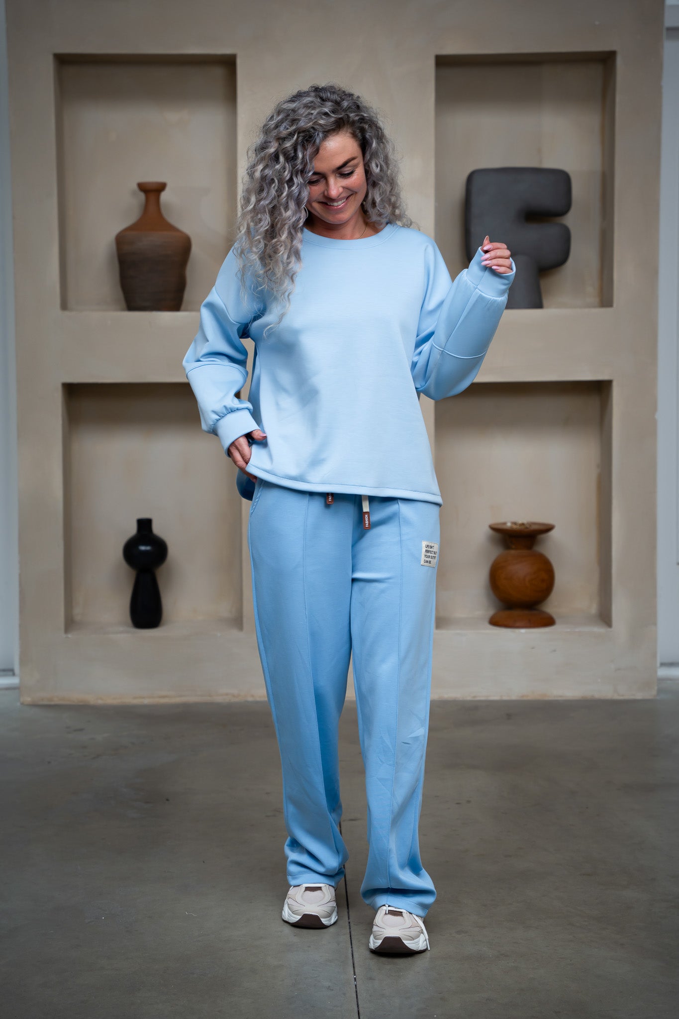 Le pull présente une coupe ample avec une ligne d’épaules large, offrant une allure moderne et décontractée. Le pantalon est agréable à porter et tombe parfaitement grâce à sa jambe droite et sa longueur confortable. Idéal pour la maison, les sorties ou une journée détente.