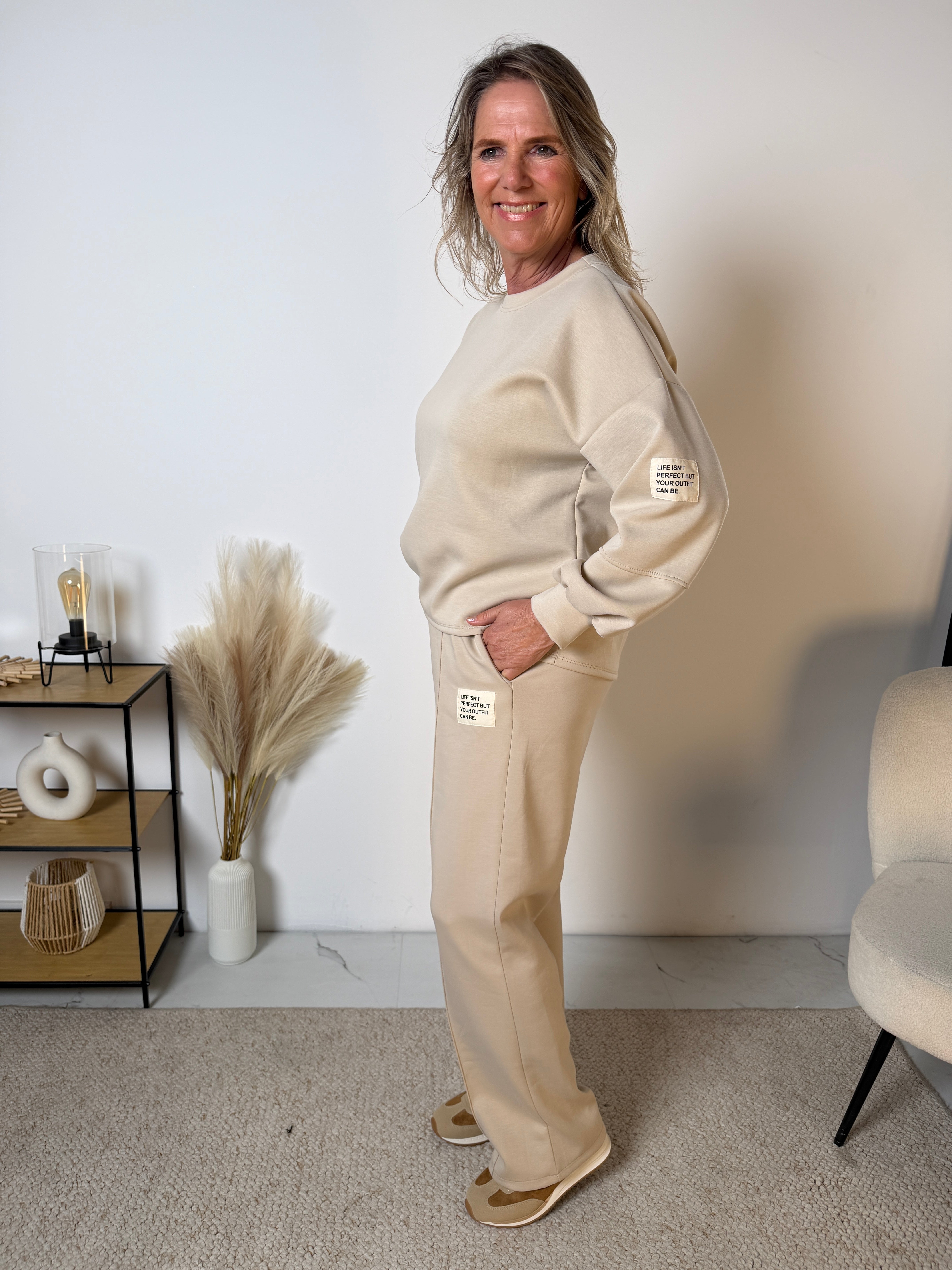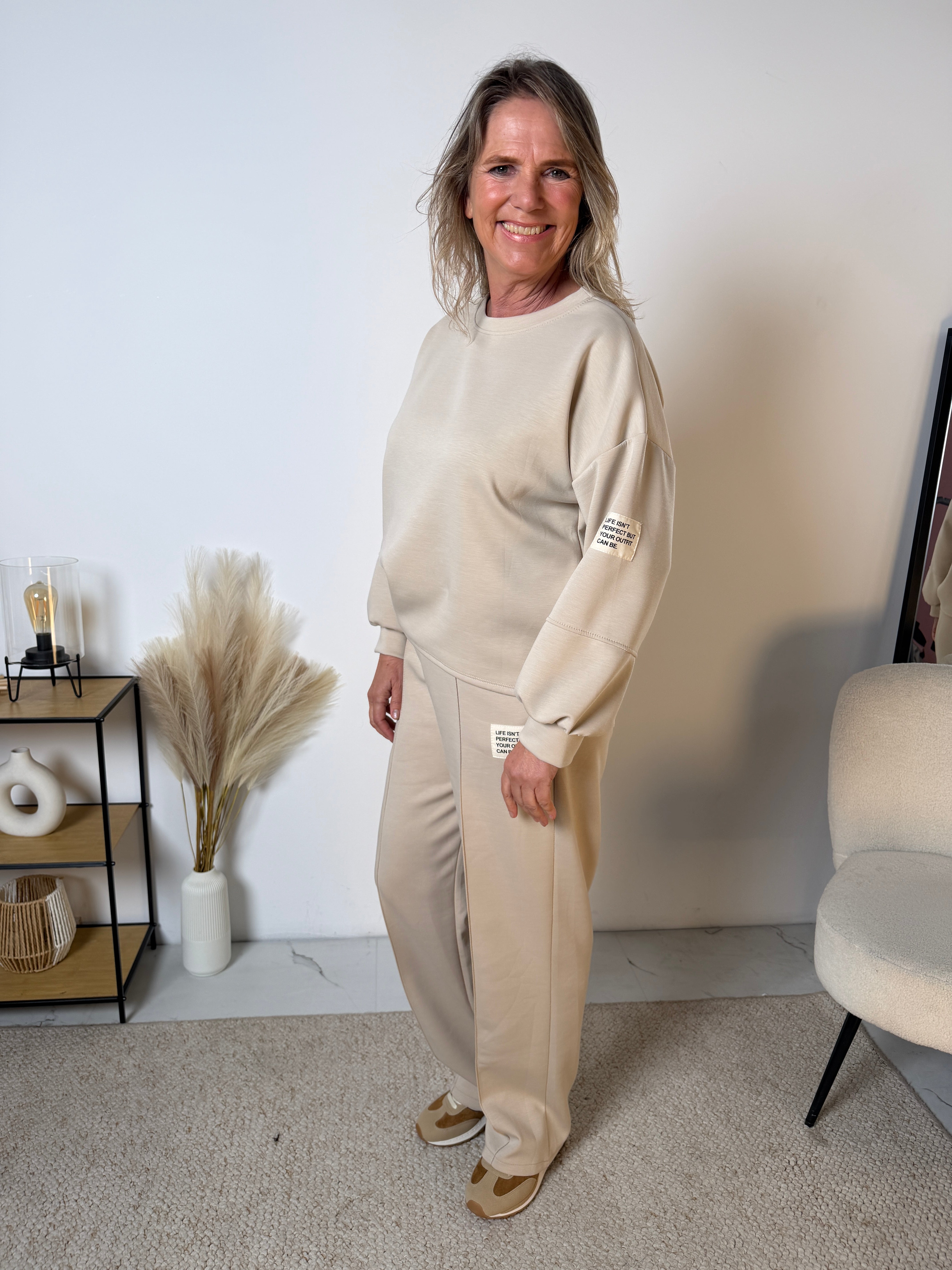 Le pull présente une coupe ample avec une ligne d’épaules large, offrant une allure moderne et décontractée. Le pantalon est agréable à porter et tombe parfaitement grâce à sa jambe droite et sa longueur confortable. Idéal pour la maison, les sorties ou une journée détente.