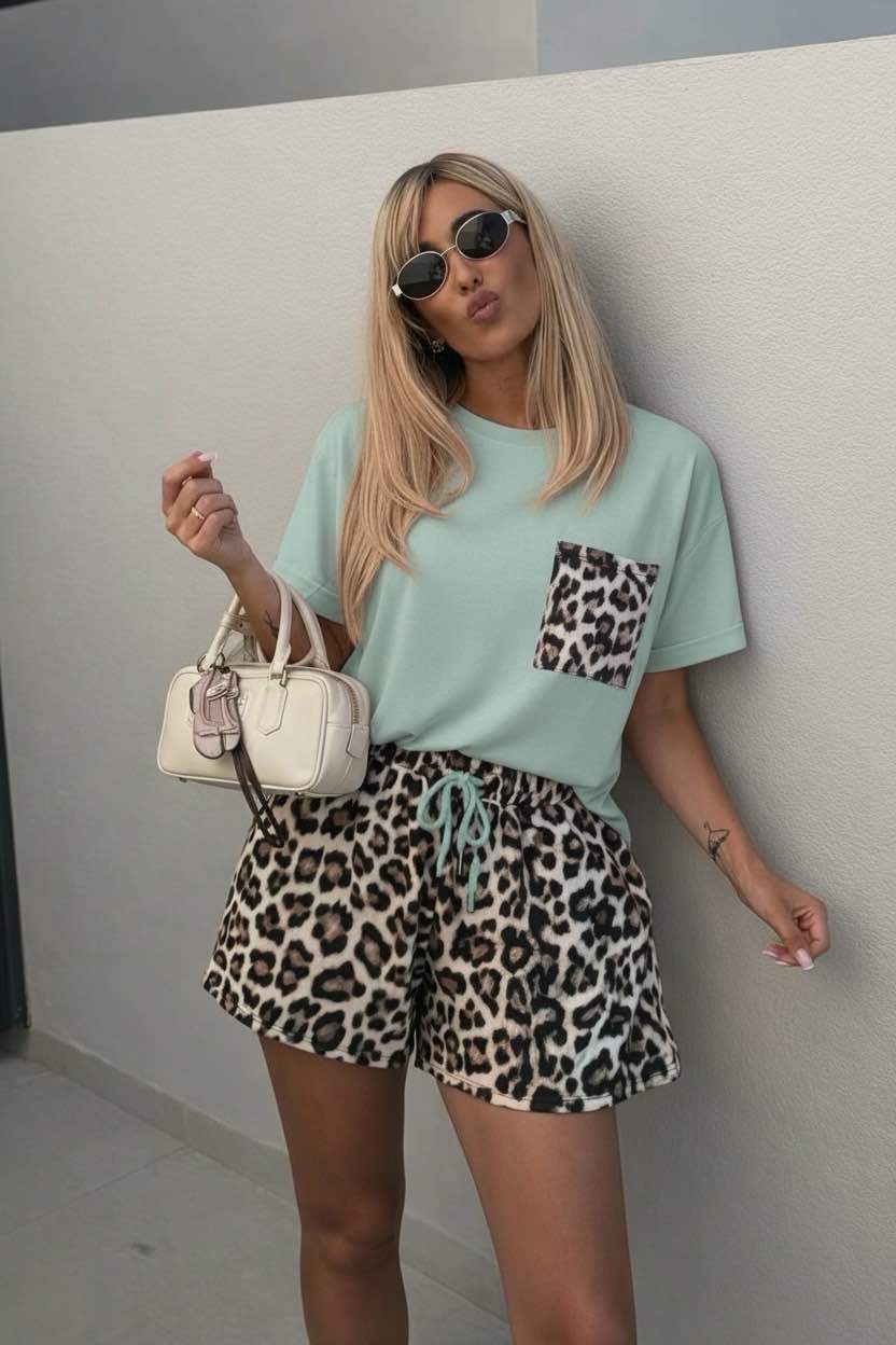 Le Leo Set est un ensemble d’été confortable et féminin qui donne immédiatement une touche ludique à votre tenue. Le T-shirt doux avec poche léopard et le short assorti à imprimé léopard créent un look tendance et facile à porter.