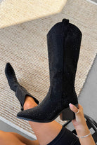 Brillez sans effort grâce aux Bottes Elegant Glitter – la pièce phare de la saison ! Ces bottes hautes au style western sont intégralement recouvertes de strass scintillants pour une allure ultra glamour. Déclinées en noir chic et argent étincelant.