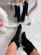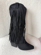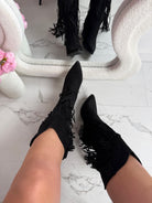 Les Bottes Hautes à Franges sont le statement à avoir cette saison. Ces bottes hautes inspirées western présentent de longues franges qui ondulent à chacun de vos pas. Le talon bloc solide et la pointe affinée leur donnent une silhouette à la fois puissante et féminine.