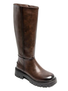 These bold knee-high boots are a must-have this season! Crafted from high-quality faux leather in a rich dark brown shade, they feature a sturdy chunky sole for extra grip and a timeless look that pairs effortlessly with all your fall and winter outfits. The inner side zipper makes them easy to slip on and off.