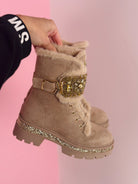 Les Stone Detail Boots ajoutent une touche de glamour à votre tenue d’hiver avec leurs pierres scintillantes et leur doublure en fausse fourrure. Réalisées en suedine douce, elles allient élégance et confort. Dotées de lacets et d’une fermeture éclair, elles sont faciles à enfiler. Le talon robuste de 4 cm offre une légère élévation sans compromettre le confort.