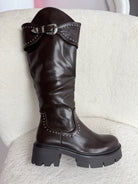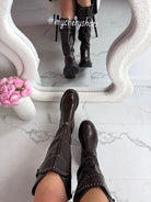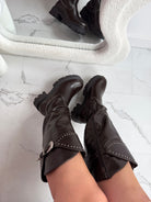 Ajoutez une touche audacieuse à votre look automne‑hiver avec les Bottes Hautes Stud Buckle. Ces bottes mêlent l’esprit western à une esthétique urbaine puissante, grâce à leur boucle argentée remarquable et leurs clous discrets. La tige haute avec fermeture éclair assure un bon maintien, tandis que la semelle épaisse apporte structure et confort.