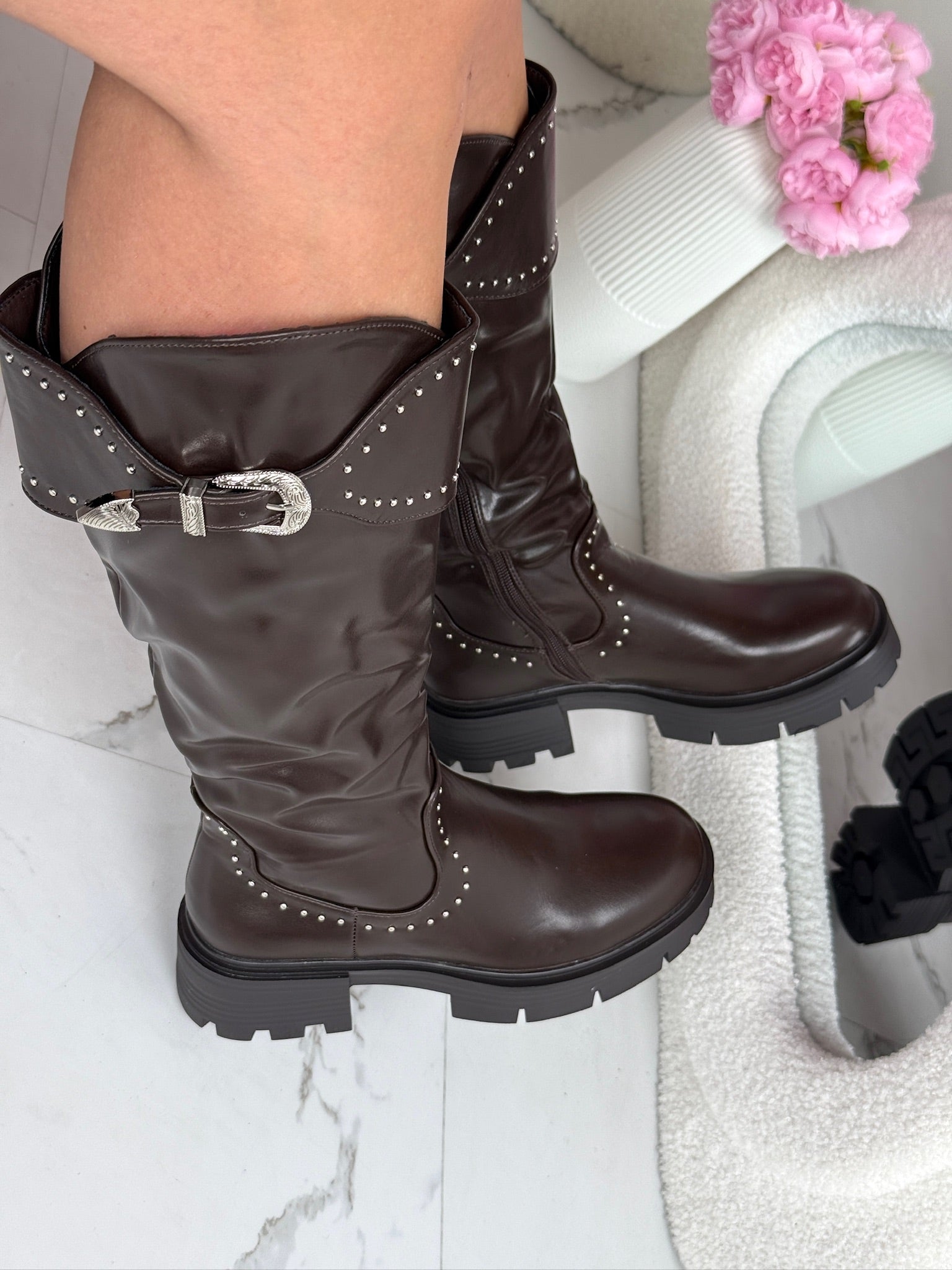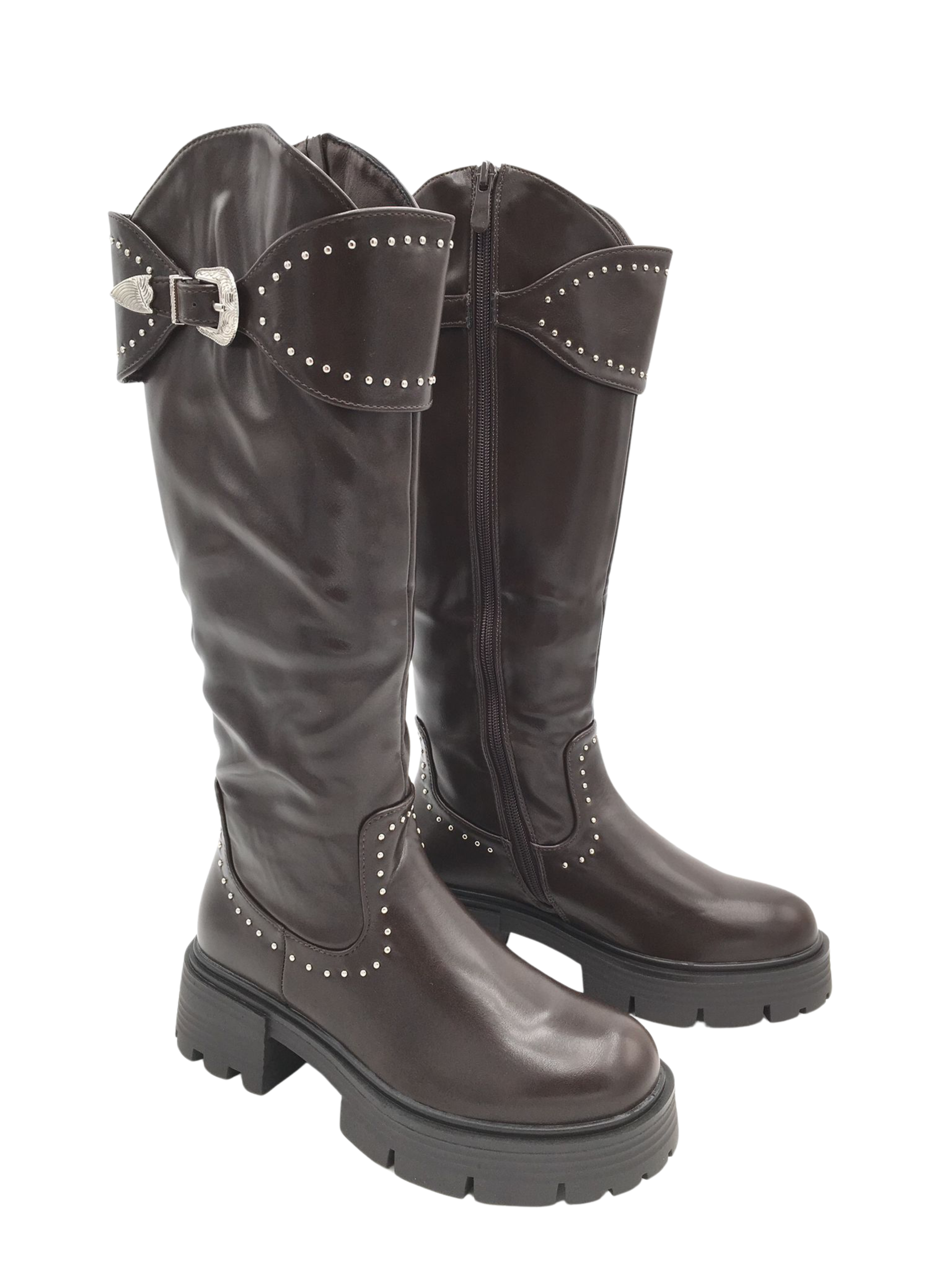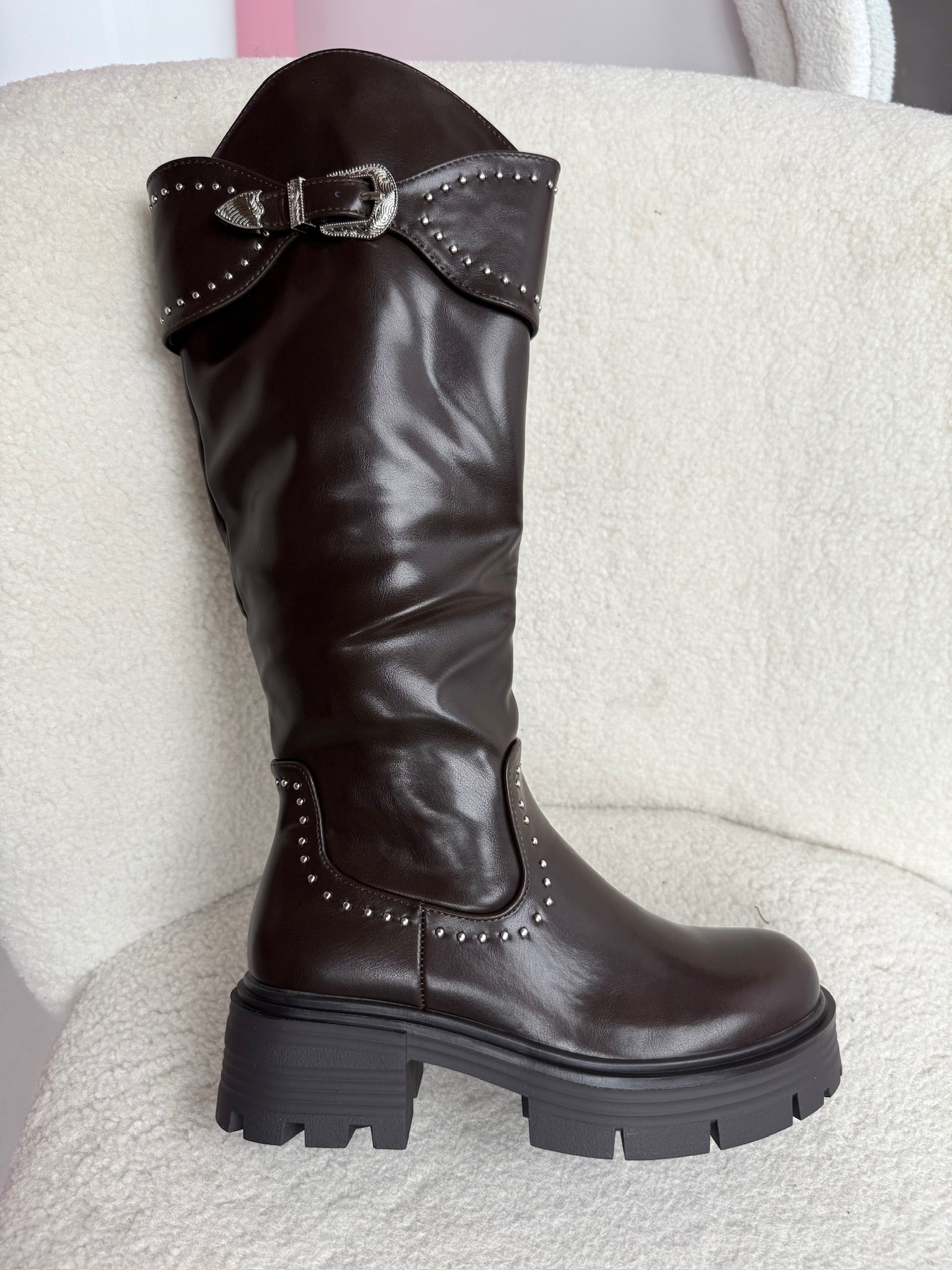 Stud Gesp Brown High Boots