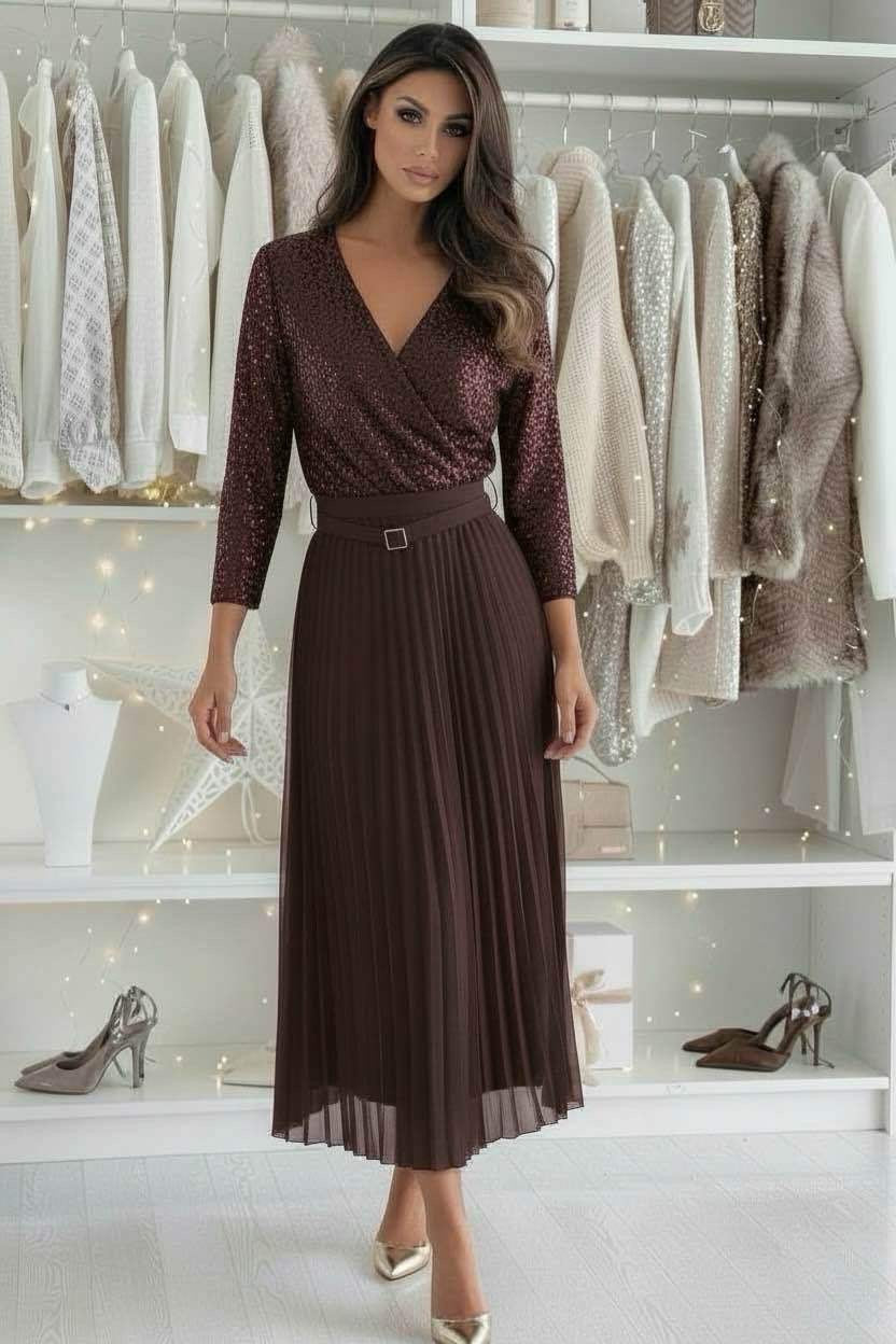 Notre Robe Maxi de Fête avec Ceinture allie élégance et glamour scintillant. Son haut pailleté et sa jupe plissée fluide en font la tenue idéale pour toutes vos occasions festives.