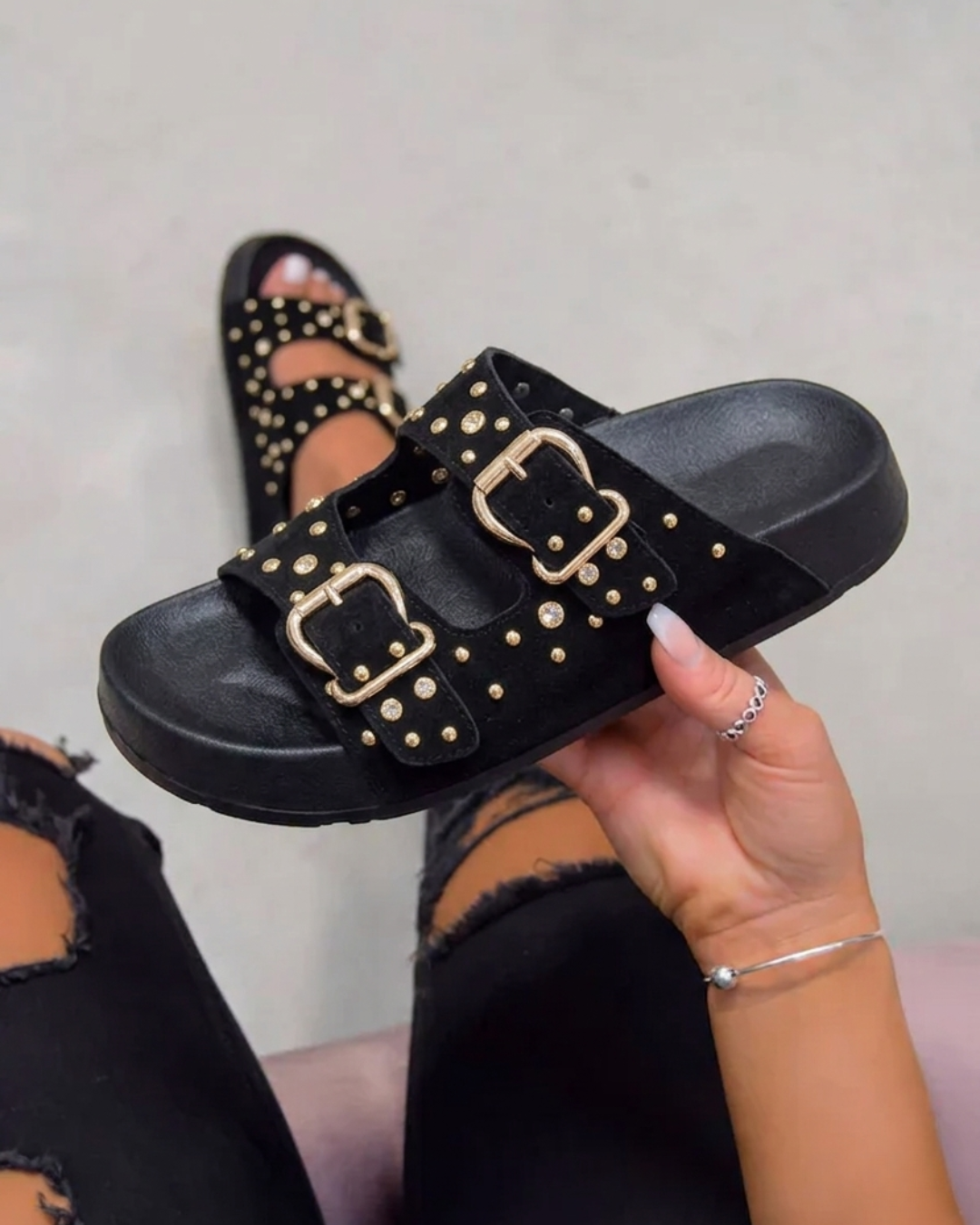 Les clous et les boucles donnent à ces sandales un look tendance, tandis que leur conception assure un bon maintien. Parfaites pour une tenue décontractée avec une touche moderne.