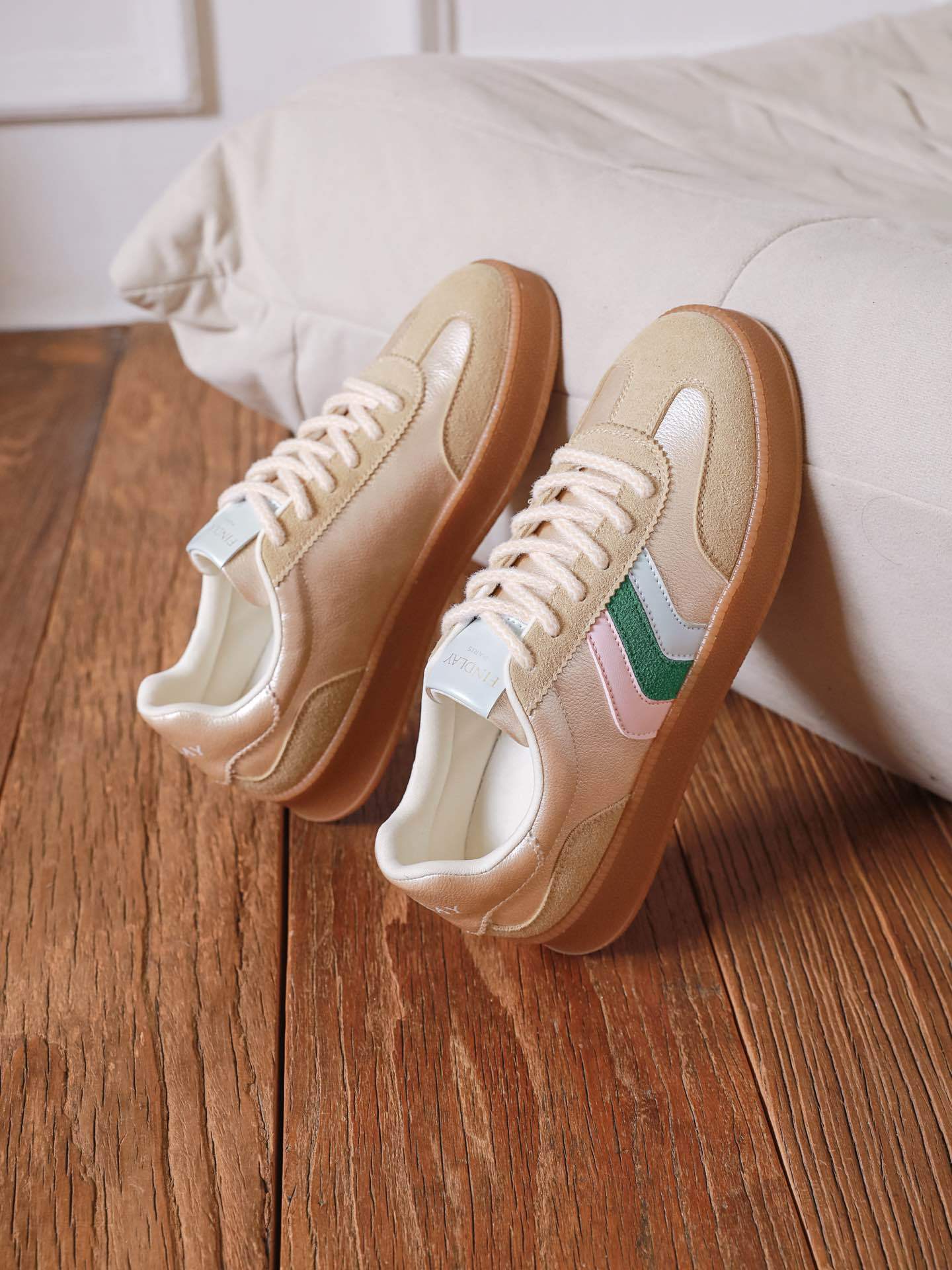 Cette sneaker associe une finition métallisée subtile avec des détails léopard pour un look moderne. Les couleurs neutres la rendent facile à assortir.