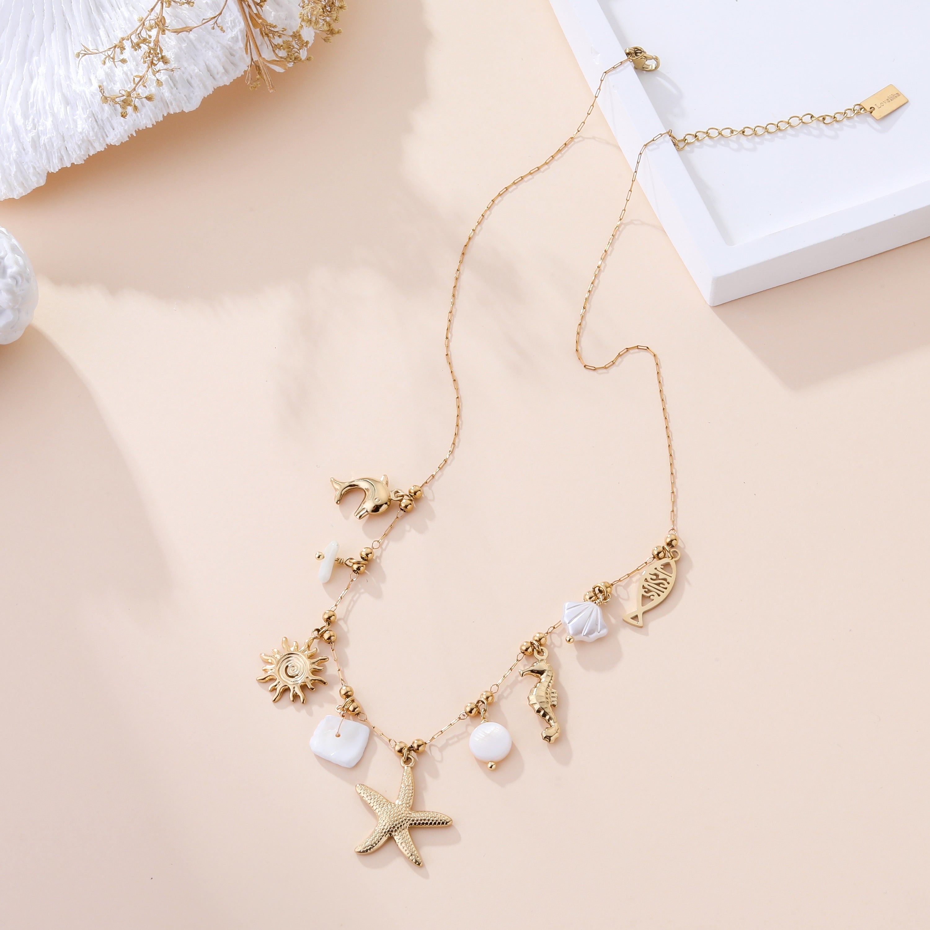 De Paradise ketting is een speelse en zomerse eyecatcher met maritieme bedels zoals een zeester, zon en schelpjes. Perfect om je outfit een beachy en elegante touch te geven.