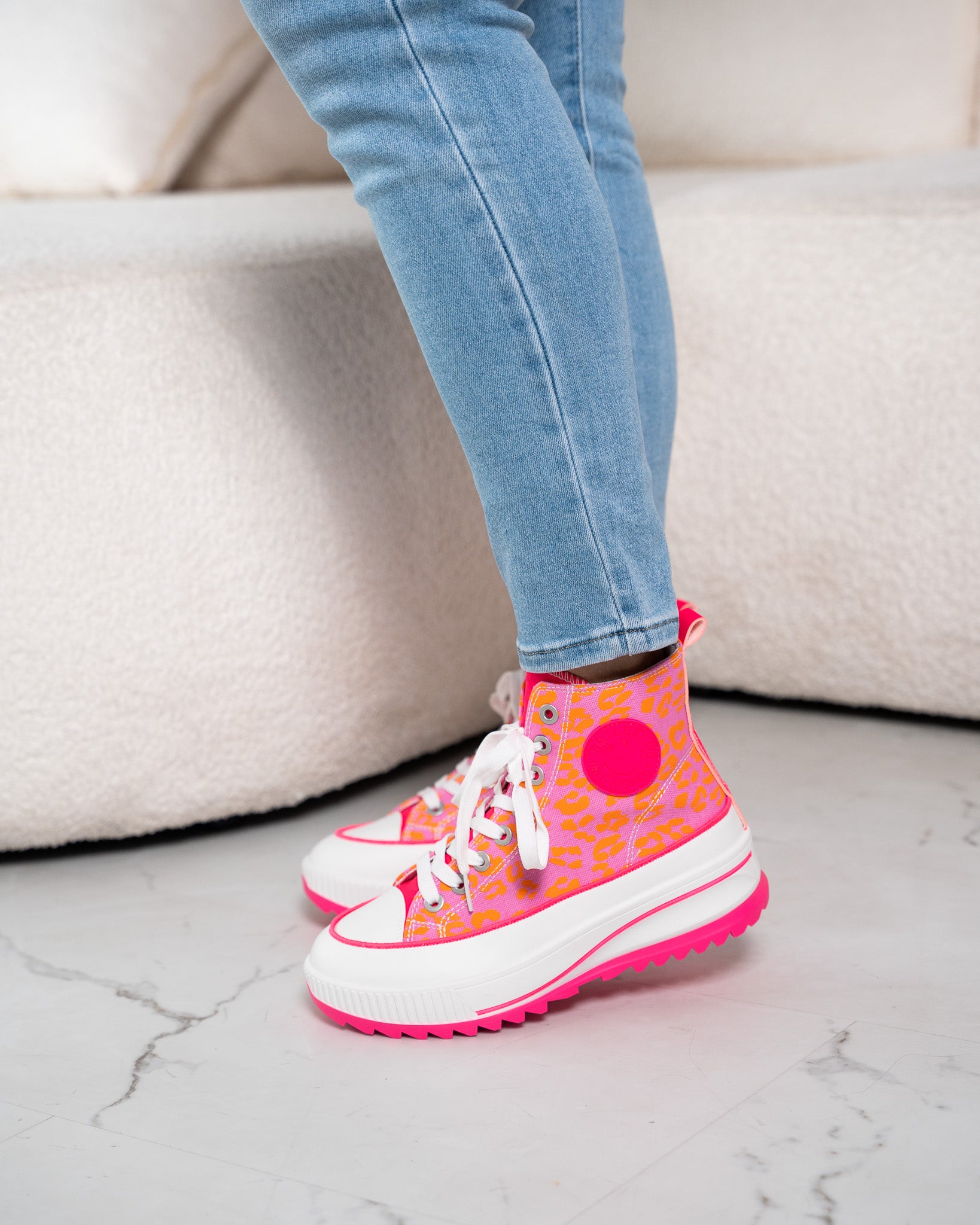DE MUST-HAVE VOOR DIT NAJAAR! Het afgelopen jaar was dit één van onze bestsellers, en dat kunnen wij goed begrijpen! Super leuke half hoge fuchsia sneakers, de oranje details maken de sneakers helemaal af! Door het hogere model ervaar je meer comfort en steun om de enkels. De opdruk van het embleem is: ' SMILE - HAVE A SMILEY DAY' De quote maakt deze schoenen helemaal af.