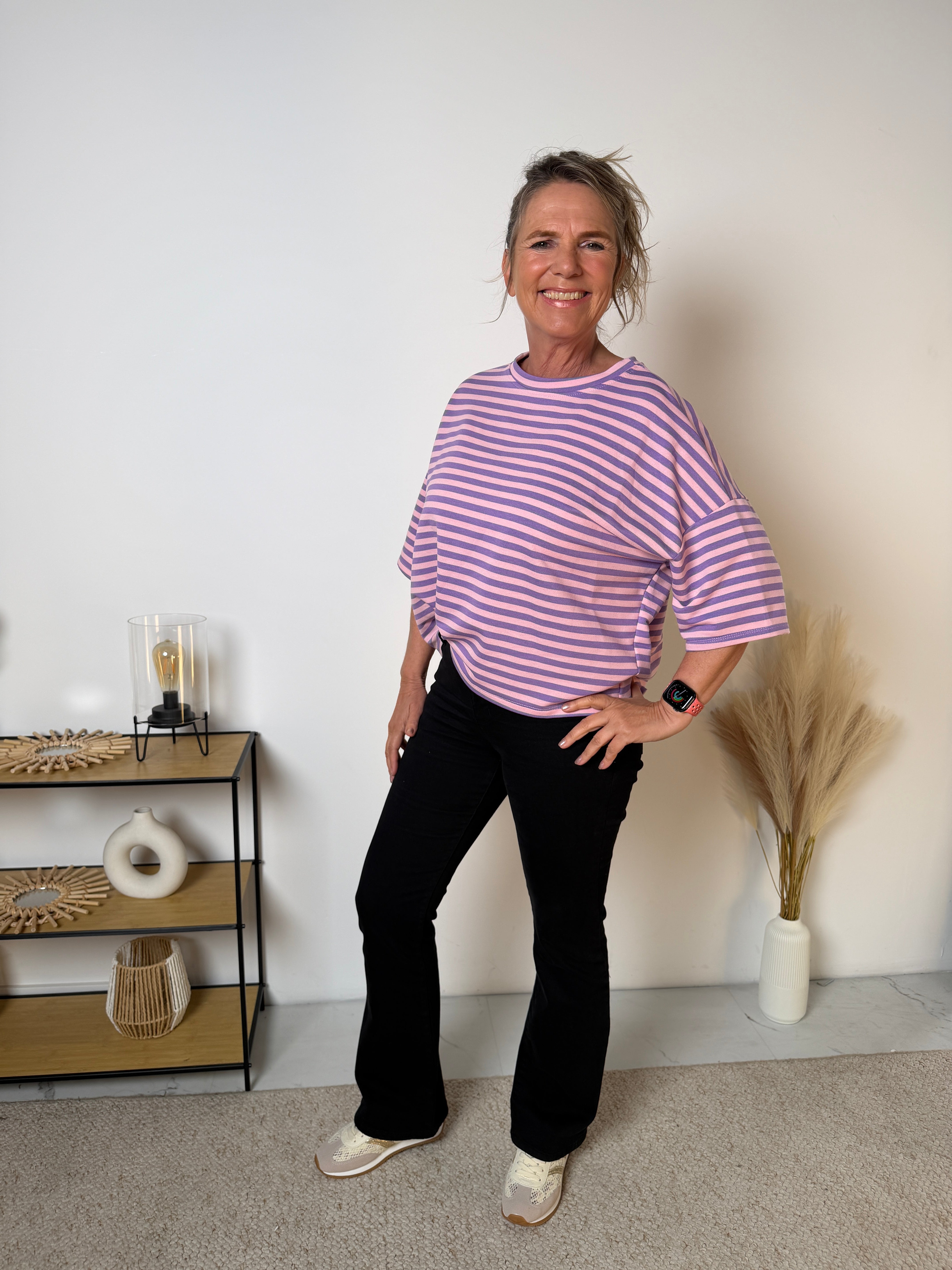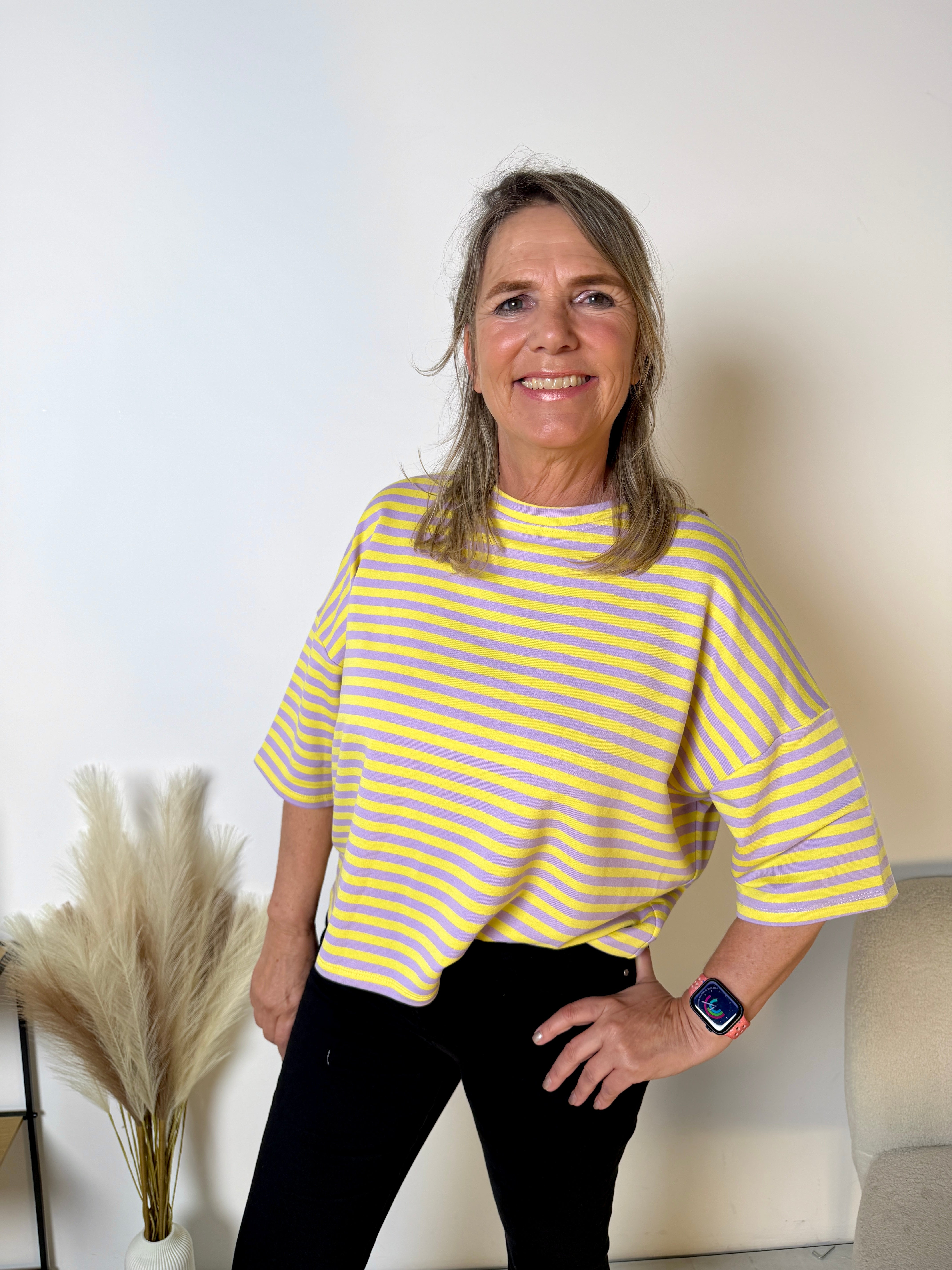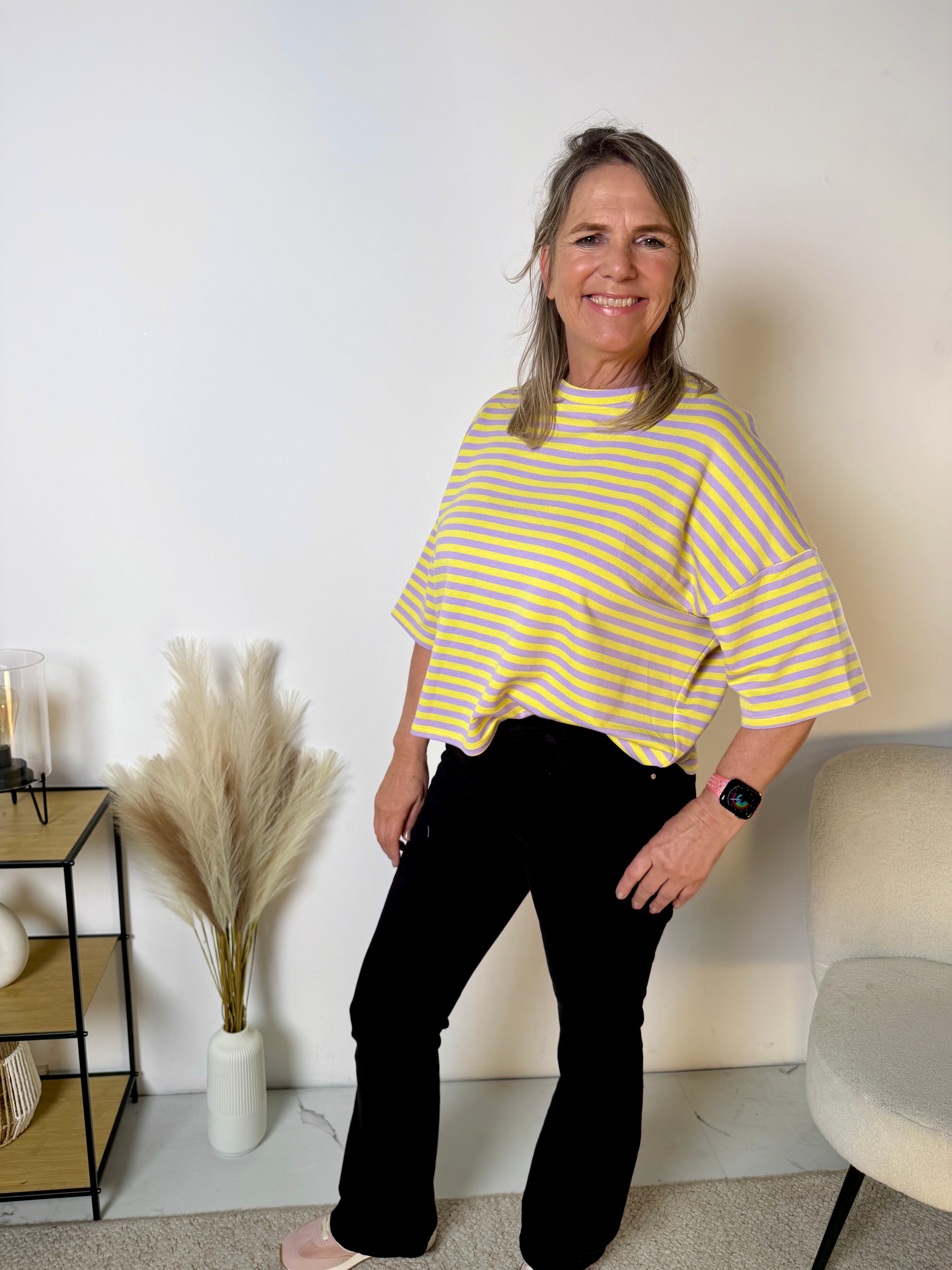 Wij hebben dit item nu in korte mouw, ideaal voor het voorjaar en de zomer. De soepele stof voelt zacht aan op de huid en draagt heerlijk comfortabel. Door de losse pasvorm valt het T-shirt mooi ruim en is het perfect te combineren met een jeans, pantalon of rok.