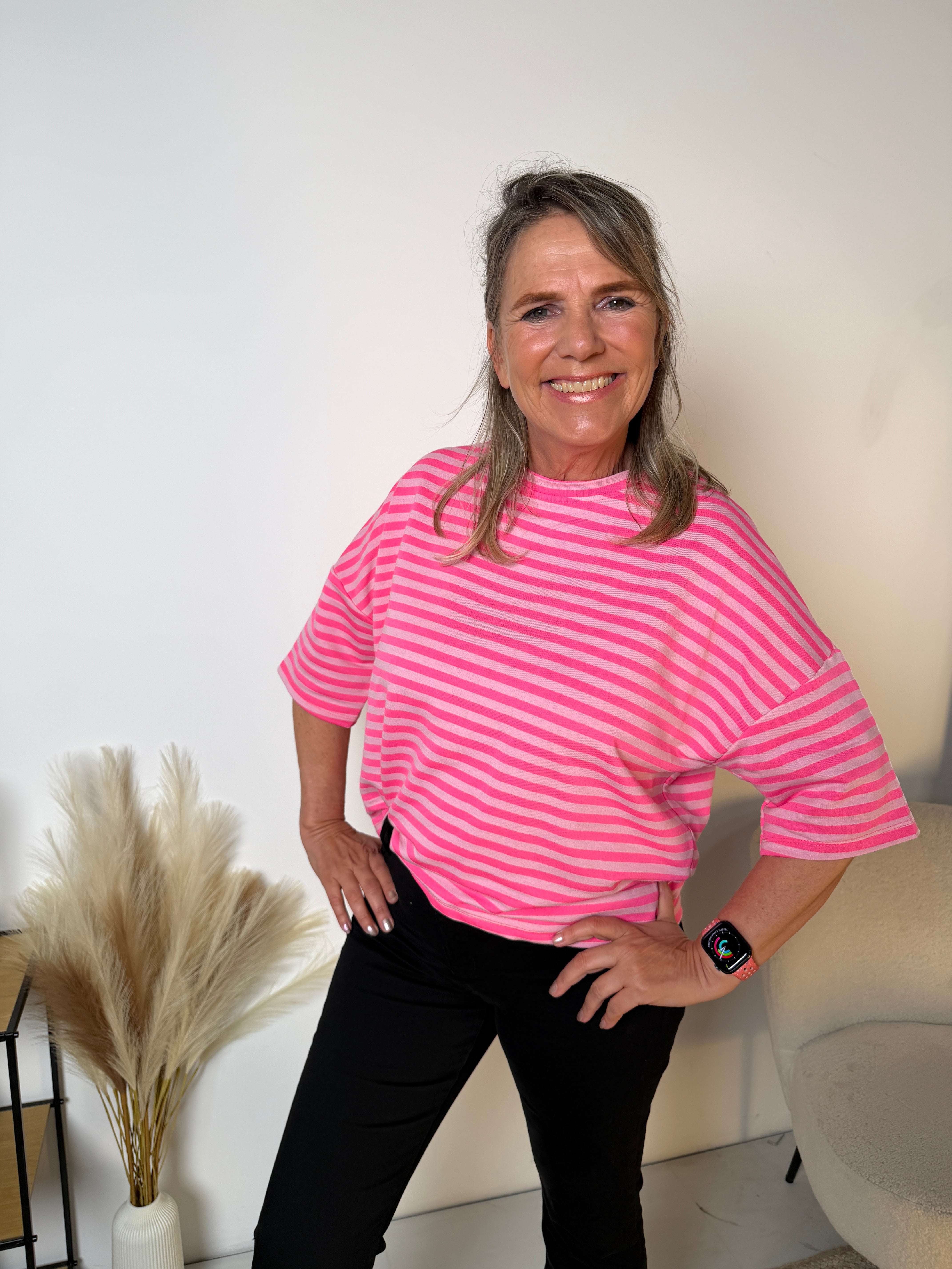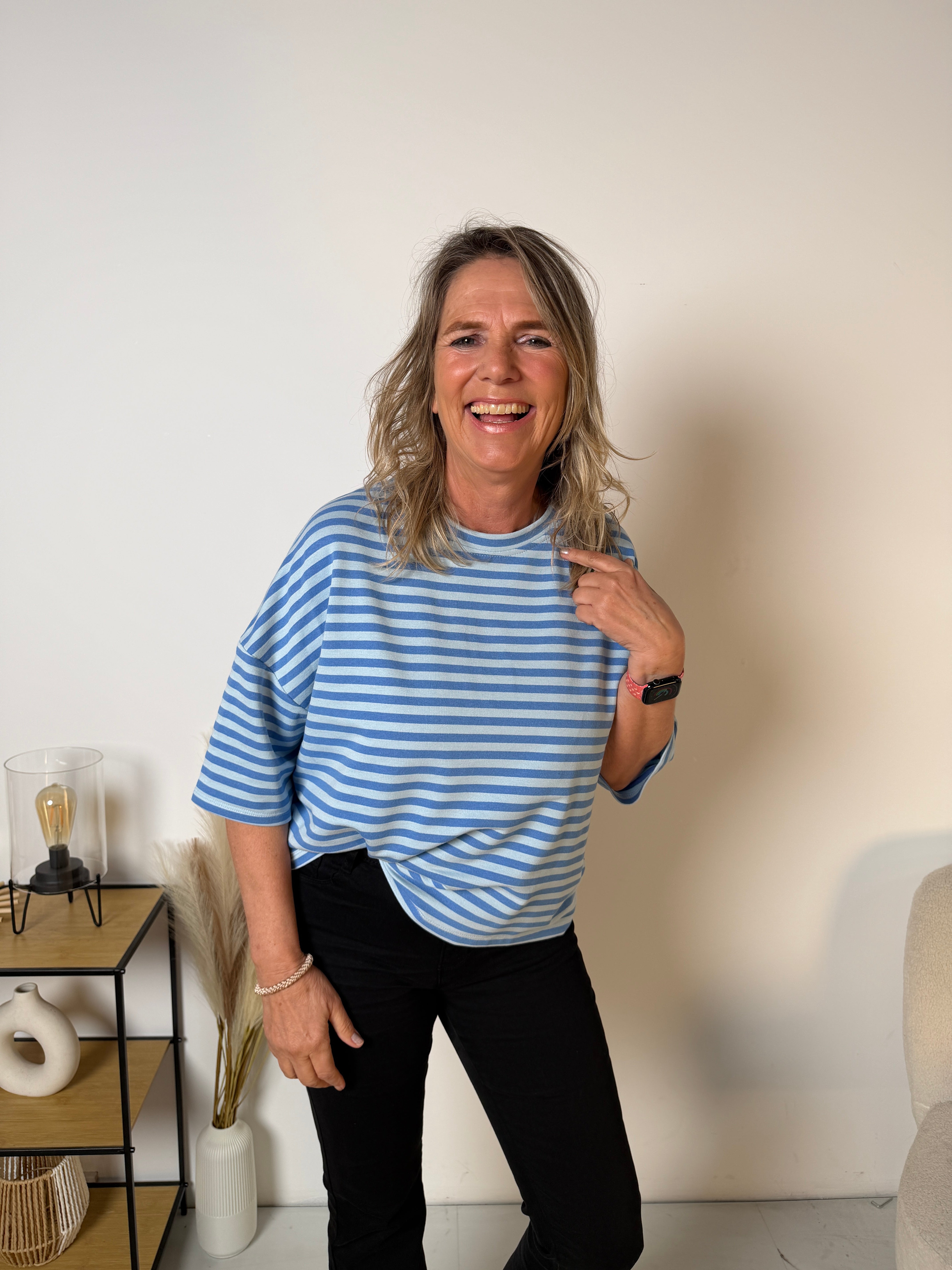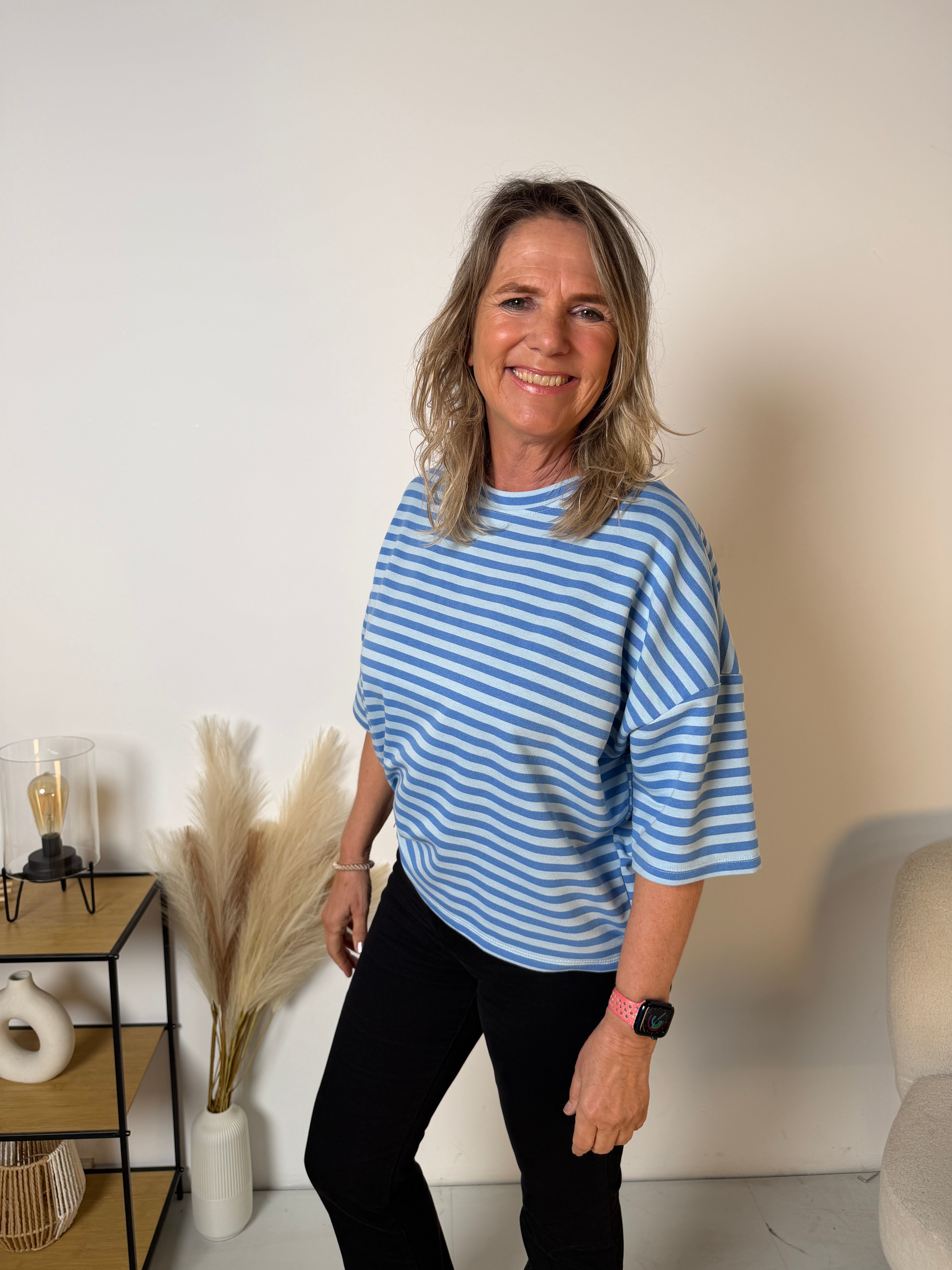 Wij hebben dit item nu in korte mouw, ideaal voor het voorjaar en de zomer. De soepele stof voelt zacht aan op de huid en draagt heerlijk comfortabel. Door de losse pasvorm valt het T-shirt mooi ruim en is het perfect te combineren met een jeans, pantalon of rok.